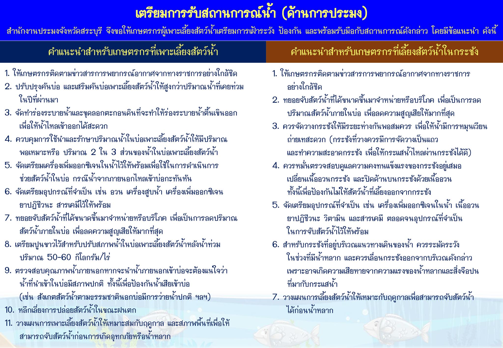 ช่วงฤดูฝนบางครั้งฝนตกหนัก ดังนั้น สำนักงานประมงจังหวัดสระบุรี จึงขอให้เกษตรกรผู้เพาะเลี้ยงสัตว์น้ำเตรียมการเฝ้าระวัง ป้องกัน และพร้อมรับมือกับสถานการณ์ดังกล่าว โดยมีข้อแนะนำ ดังนี้