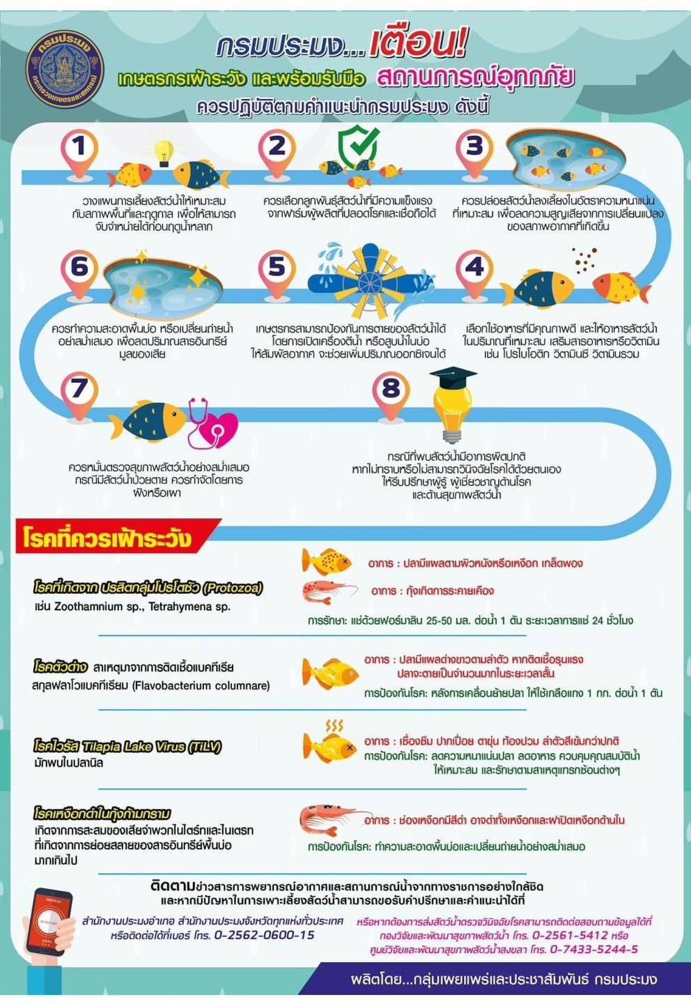 กรมประมงจึงแจ้งเตือนให้เกษตรกรเตรียมพร้อมรับมือกับโรคในสัตว์น้ำที่อาจจะเกิดขึ้น ได้แก่