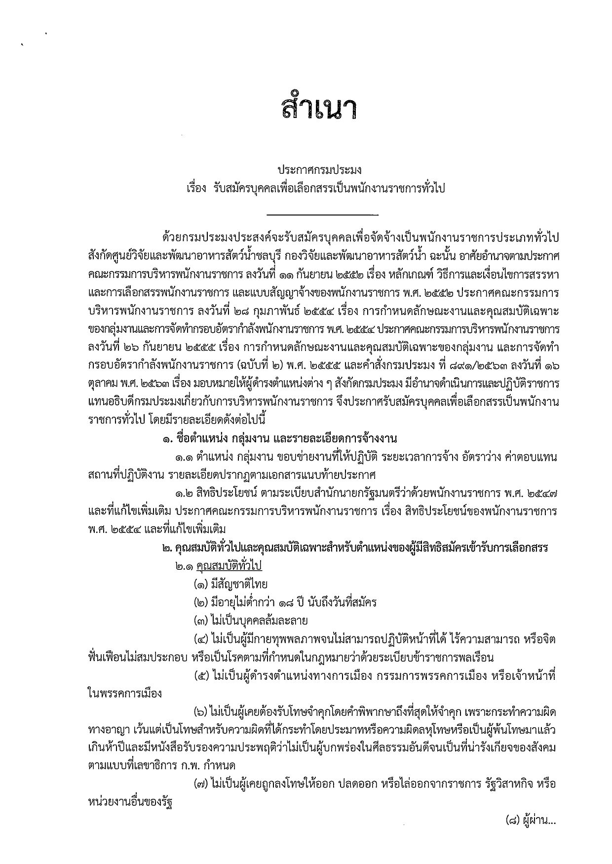 รับสมัครบุคคลเพื่อเลือกสรรเป็นพนักงานราชการทั่วไป ตำแหน่ง พนักงานผู้ช่วยประมง สังกัดศูนย์วิจัยเเละพัฒนาอาหารสัตว์น้ำชลบุรี