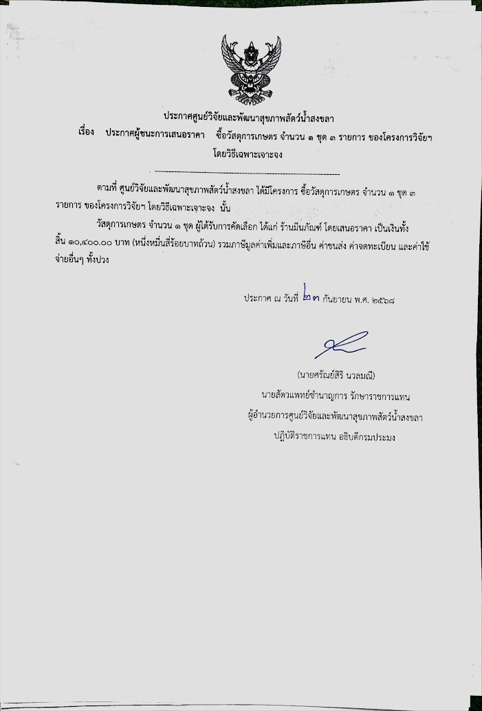 ตามที่ ศูนย์วิจัยและพัฒนาสุขภาพสัตว์น้ำสงขลา ได้มีโครงการ ซื้อวัสดุการเกษตร จำนวน ๑ ชุด ๓ รายการ ของโครงการวิจัยฯ โดยวิธีเฉพาะเจาะจง นั้น วัสดุการเกษตร จำนวน ๑ ชุด ผู้ได้รับการคัดเลือก ได้แก่ ร้านมีนภัณฑ์ โดยเสนอราคา เป็นเงินทั้ง สิ้น ๑๐,๔๐๐.๐๐ บาท (หนึ่งหมื่นสี่ร้อยบาทถ้วน) รวมภาษีมูลค่าเพิ่มและภาษีอื่น ค่าขนส่ง ค่าจดทะเบียน และค่าใช้ จ่ายอื่นๆ ทั้งปวง