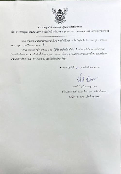 ประกาศผู้ชนะการเสนอราคา ซื้อวัสดุไฟฟ้า จำนวน ๑ ชุด ๗ รายการ ของงานธุรการ โดยวิธีเฉพาะเจาะจง