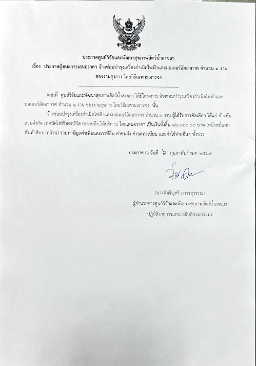 ประกาศผู้ชนะการเสนอราคา จ้างซ่อมบำรุงเครื่องกำเนิดไฟฟ้าและมอเตอร์อัดอากาศ จำนวน ๑ งาน ของงานธุรการ โดยวิธีเฉพาะเจาะจง