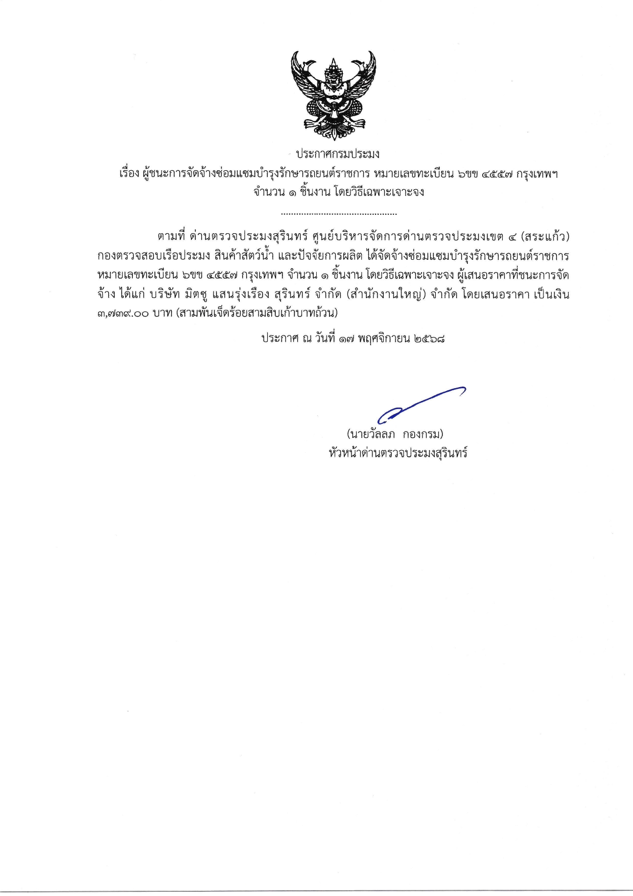 ผู้ชนะการจัดจ้างซ่อมแซมบำรุงรักษารถยนต์ราชการ หมายเลขทะเบียน 6ขข 4557 กรุงเทพฯ จำนวน 1 รายการ โดยวิธีเฉพาะเจาะจง