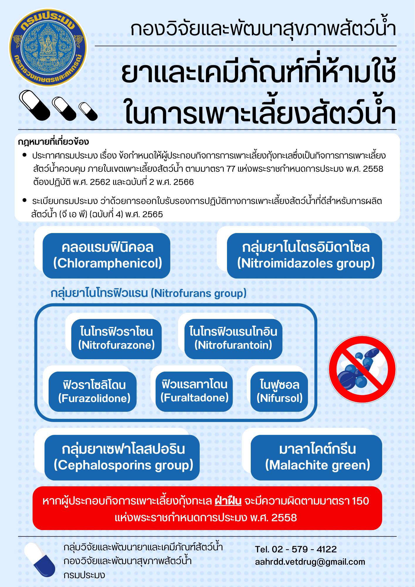 สอบถามเพิ่มเติม: กองวิจัยและพัฒนาสุขภาพสัตว์น้ำ กรมประมง      โทร. 0-2579-4122       อีเมล: aahrdd.vetdrug@gmail.com