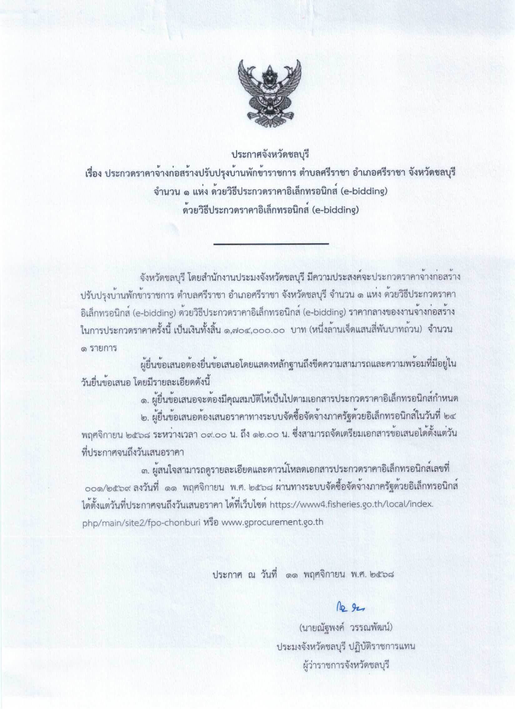 ประกาศจังหวัดชลบุรี เรื่อง ประกวดราคาจ้างก่อสร้างปรับปรุงบ้านพักข้าราชการ ตำบลศรีราชา อำเภอศรีราชา จังหวัดชลบุรี จำนวน 1 แห่ง ด้วยวิธีประกวดราคาอิเล็กทรอนิกส์ (e-bidding)