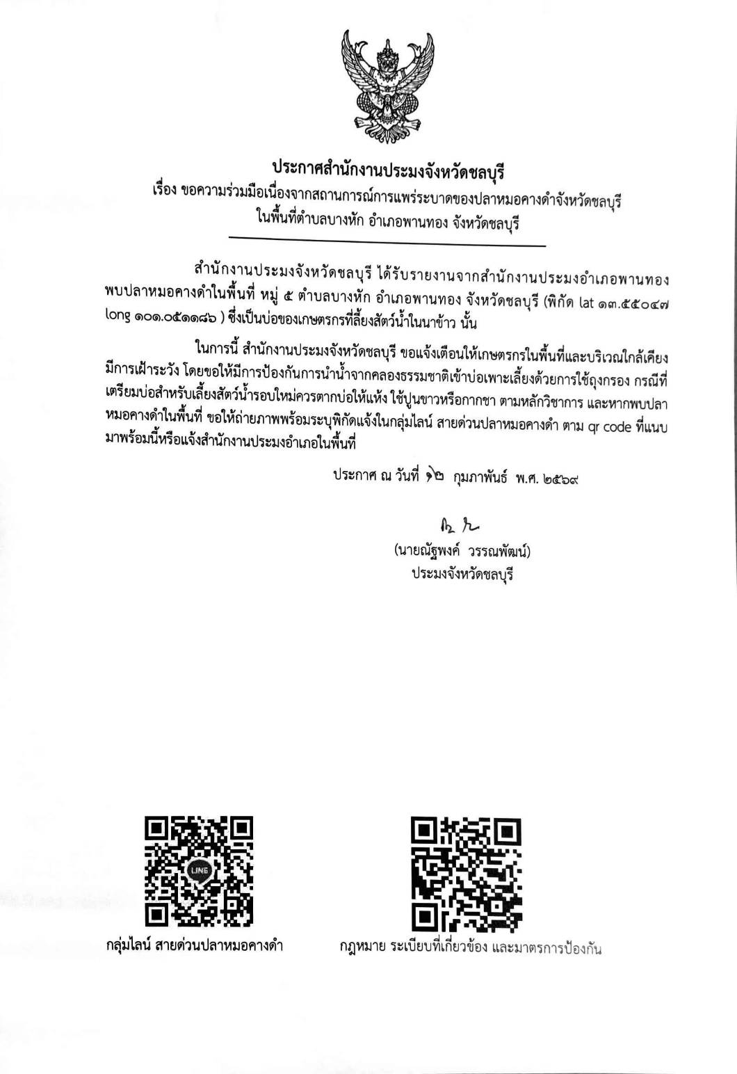 ประกาศสำนักงานประมงจังหวัดชลบุรี เรื่อง ขอความร่วมมือเนื่องจากสถานการณ์การแพร่ระบาดของปลาหมอคางดำจังหวัดชลบุรีในพื้นที่ตำบลบางหัก อำเภอพานทอง จังหวัดชลบุรี