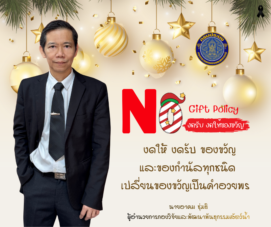 ด้วยกองวิจัยและพัฒนาพันธุกรรมสัตว์น้ำ ได้ตระหนักและให้ความสำคัญในการป้องกันการทุจริตทุกรูปแบบ จึงได้ประกาศเจตนารมณ์ไม่รับของขวัญและของกำนัลทุกชนิดจากการปฏิบัติหน้าที่ (No Gift Policy) ประจำปีงบประมาณ พ.ศ. 2569 เพื่อแสดงเจตนารมณ์ของผู้บริหาร และเจ้าหน้าที่ของกองวิจัยและพัฒนาพันธุกรรมสัตว์น้ำทุกคน จะไม่รับของขวัญและของกำนัลทุกชนิดจากการปฏิบัติหน้าที่ ทั้งในขณะ ก่อน และหลังการปฏิบัติหน้าที่ในทุกโอกาสและทุกเทศกาล