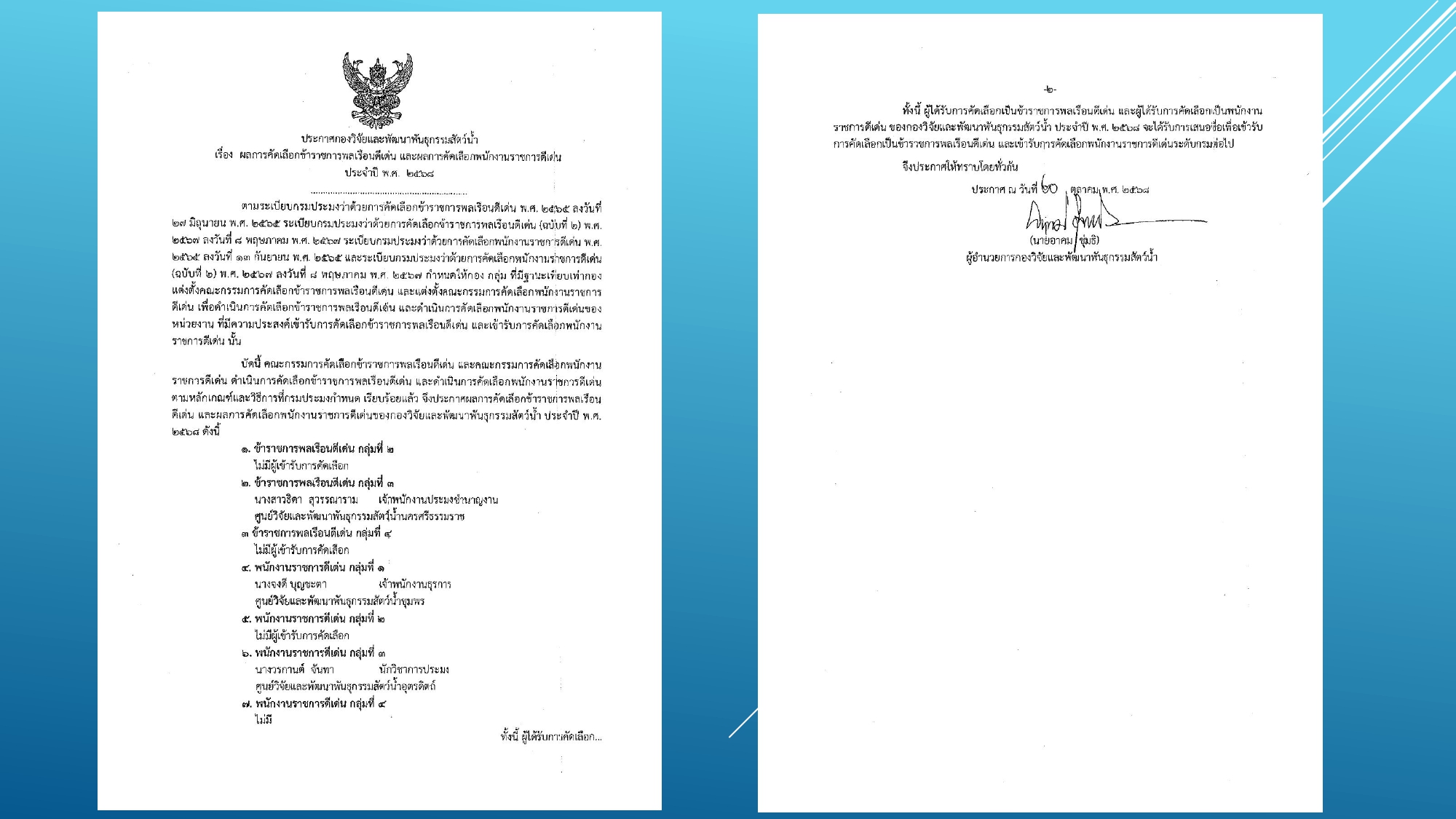 ประกาศผลการคัดเลือกข้าราชการพลเรือนดีเด่น และพนักงานราชการดีเด่นของกองวิจัยและพัฒนาพันธุกรรมสัตว์น้ำ ประจำปี พ.ศ. 2568