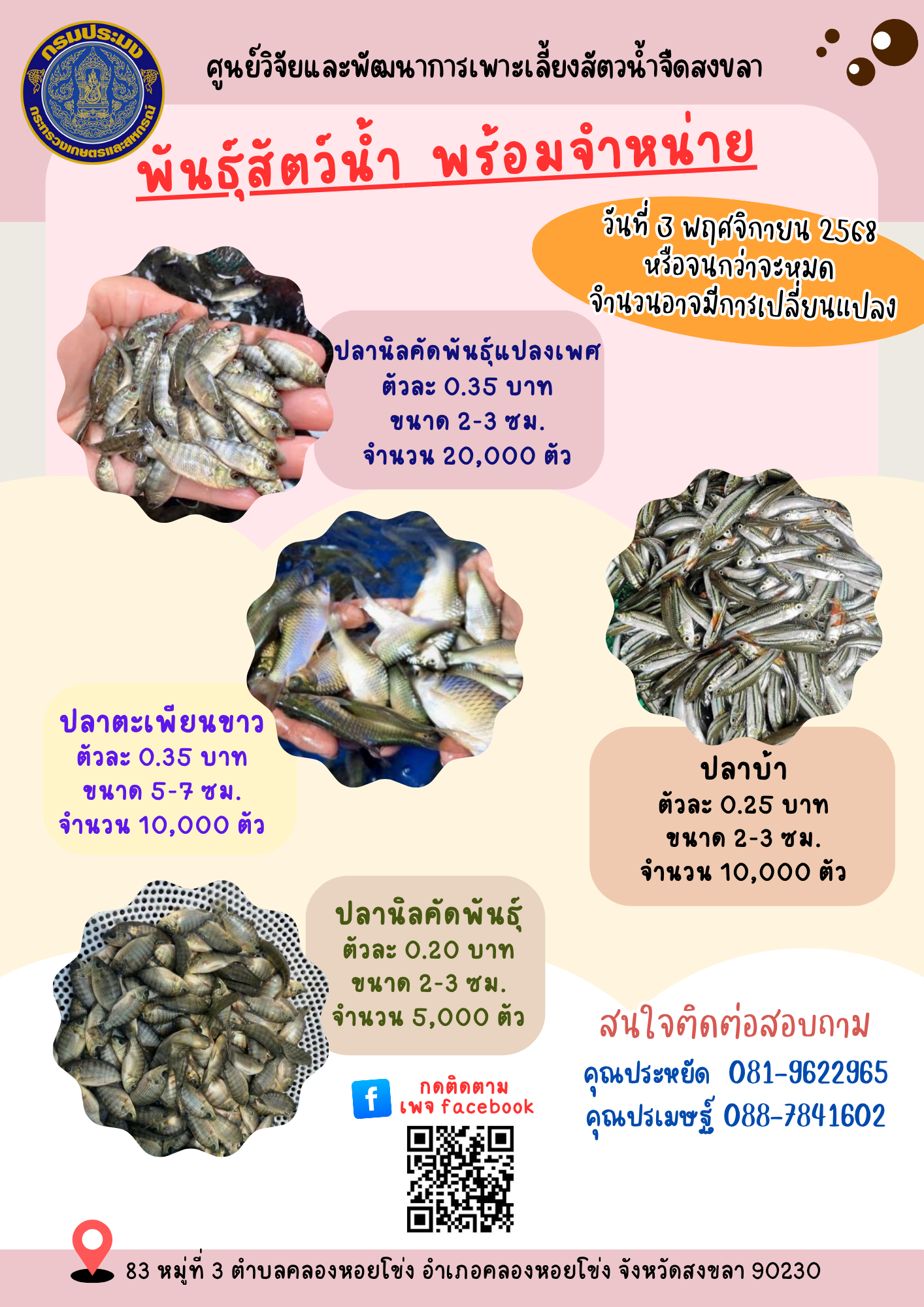 ศูนย์วิจัยและพัฒนาการเพาะเลี้ยงสัตว์น้ำจืดสงขลา จำหน่ายพันธุ์สัตว์น้ำ วันที่ 3 พฤศจิกายน 2568 หรือจนกว่าจะหมด จำนวนอาจมีการเปลี่ยนแปลง