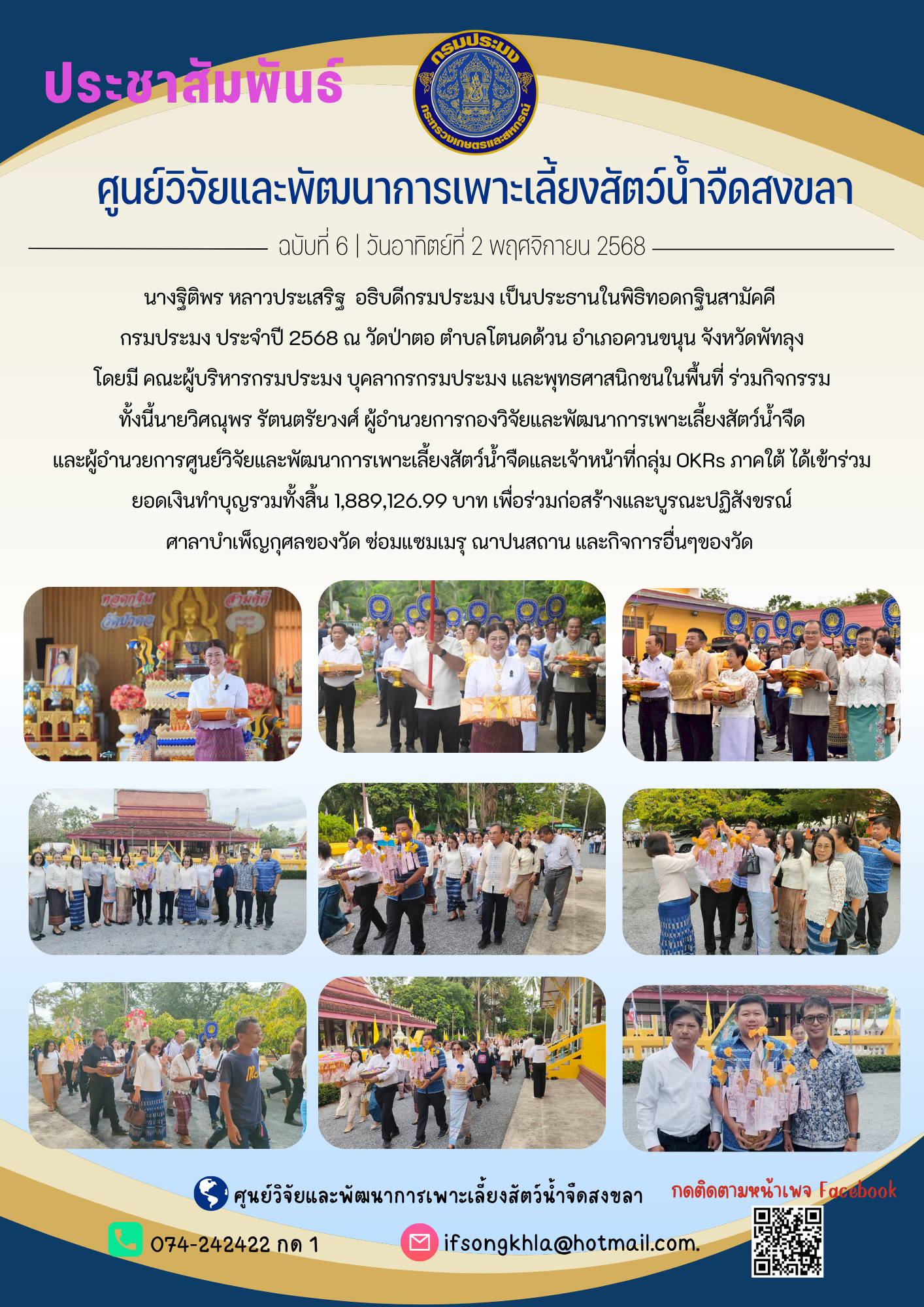 ข่าวประชาสัมพันธ์ ฉบับที่ 6/2569 นางฐิติพร หลาวประเสริฐ อธิบดีกรมประมง เป็นประธานในพิธิทอดกฐินสามัคคี กรมประมง ประจำปี 2568 ณ วัดป่าตอ ตำบลโตนดด้วน อำเภอควนขนุน จังหวัดพัทลุง โดยมี คณะผู้บริหารกรมประมง บุคลากรกรมประมง และพุทธศาสนิกชนในพื้นที่ ร่วมกิจกรรม ทั้งนี้นายวิศณุพร รัตนตรัยวงศ์ ผู้อำนวยการกองวิจัยและพัฒนาการเพาะเลี้ยงสัตว์น้ำจืด และผู้อำนวยการศูนย์วิจัยและพัฒนาการเพาะเลี้ยงสัตว์น้ำจืดและเจ้าหน้าที่กลุ่ม OKRs ภาคใต้ ได้เข้าร่วม ยอดเงินทำบุญรวมทั้งสิ้น 1,889,126.99 บาท เพื่อร่วมก่อสร้างและบูรณะปฏิสังขรณ์ ศาลาบำเพ็ญกุศลของวัด ซ่อมแซมเมรุ ณาปนสถาน และกิจการอื่นๆของวัด