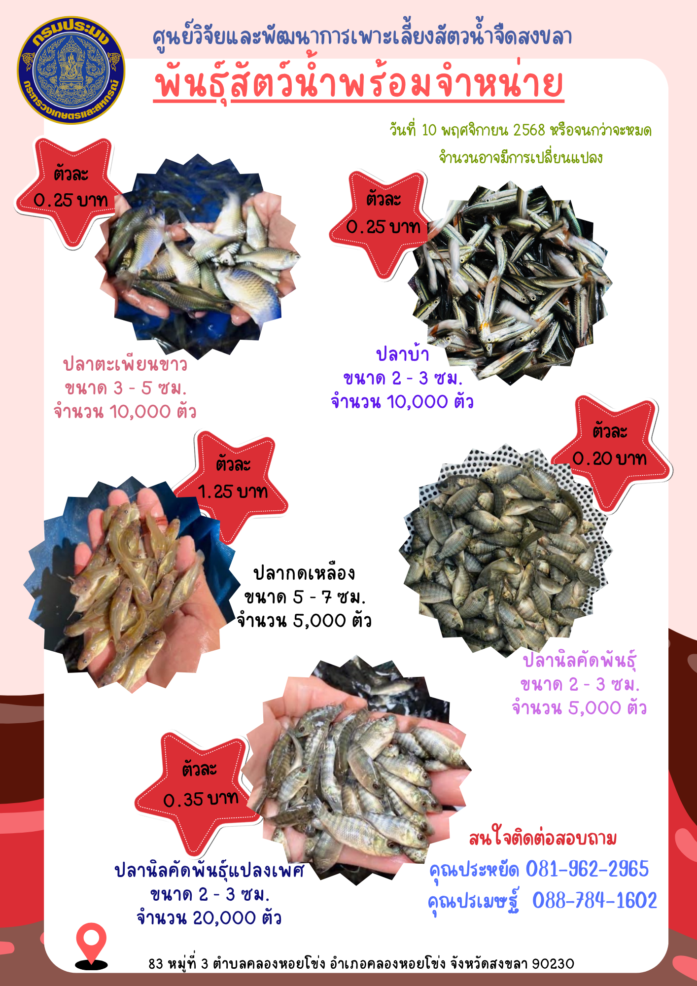 ศูนย์วิจัยและพัฒนาการเพาะเลี้ยงสัตว์น้ำจืดสงขลา จำหน่ายพันธุ์สัตว์น้ำ ประจำวันที่ 10 พฤศจิกายน 2568 หรือจนกว่าจะหมด จำนวนอาจมีการเปลี่ยนแปลง