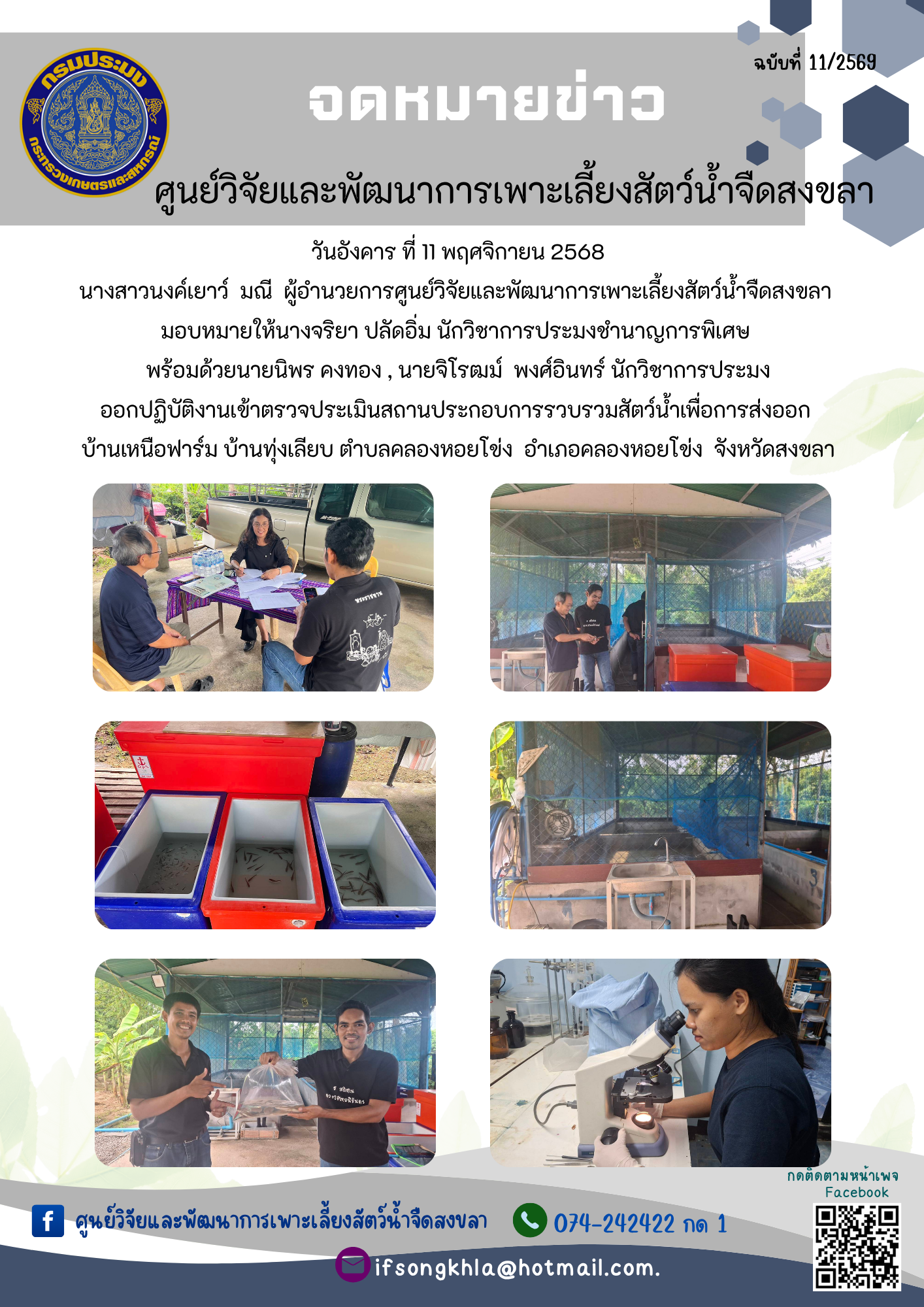 ข่าวประชาสัมพันธ์ ฉบับที่ 11/2569 วันอังคาร ที่ 11 พฤศจิกายน 2568 นางสาวนงค์เยาว์ มณี ผู้อำนวยการศูนย์วิจัยและพัฒนาการเพาะเลี้ยงสัตว์น้ำจืดสงขลา มอบหมายให้นางจริยา ปลัดอิ่ม นักวิชาการประมงชำนาญการพิเศษ พร้อมด้วยนายนิพร คงทอง , นายจิโรฒม์ พงศ์อินทร์ นักวิชาการประมง ออกปฏิบัติงานเข้าตรวจประเมินสถานประกอบการรวบรวมสัตว์น้ำเพื่อการส่งออก บ้านเหนือฟาร์ม บ้านทุ่งเลียบ ตำบลคลองหอยโข่ง อำเภอคลองหอยโข่ง จังหวัดสงขลา