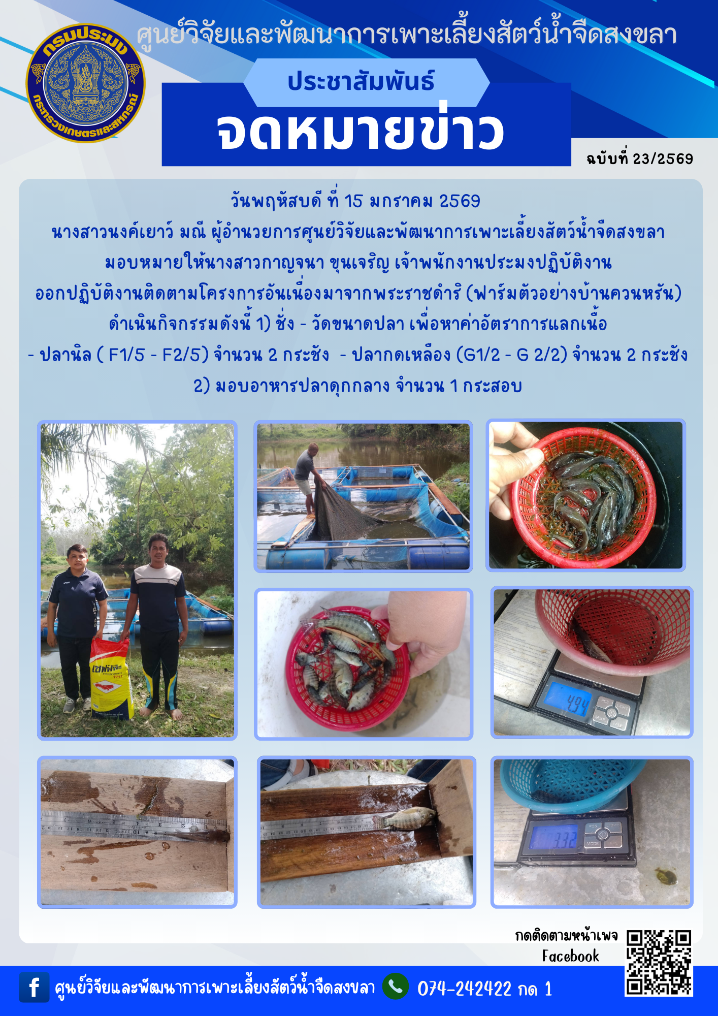 ข่าวประชาสัมพันธ์ ฉบับที่ 23/2569 วันพฤหัสบดี ที่ 15 มกราคม 2569 นางสาวนงค์เยาว์ มณี ผู้อำนวยการศูนย์วิจัยและพัฒนาการเพาะเลี้ยงสัตว์น้ำจืดสงขลา มอบหมายให้นางสาวกาญจนา ขุนเจริญ เจ้าพนักงานประมงปฏิบัติงาน ออกปฏิบัติงานติดตามโครงการอันเนื่องมาจากพระราชดำริ (ฟาร์มตัวอย่างบ้านควนหรัน) ดำเนินกิจกรรมดังนี้ 1) ชั่ง - วัดขนาดปลา เพื่อหาค่าอัตราการแลกเนื้อ - ปลานิล ( F1/5 - F2/5) จำนวน 2 กระชัง - ปลากดเหลือง (G1/2 - G 2/2) จำนวน 2 กระชัง 2) มอบอาหารปลาดุกกลาง จำนวน 1 กระสอบ