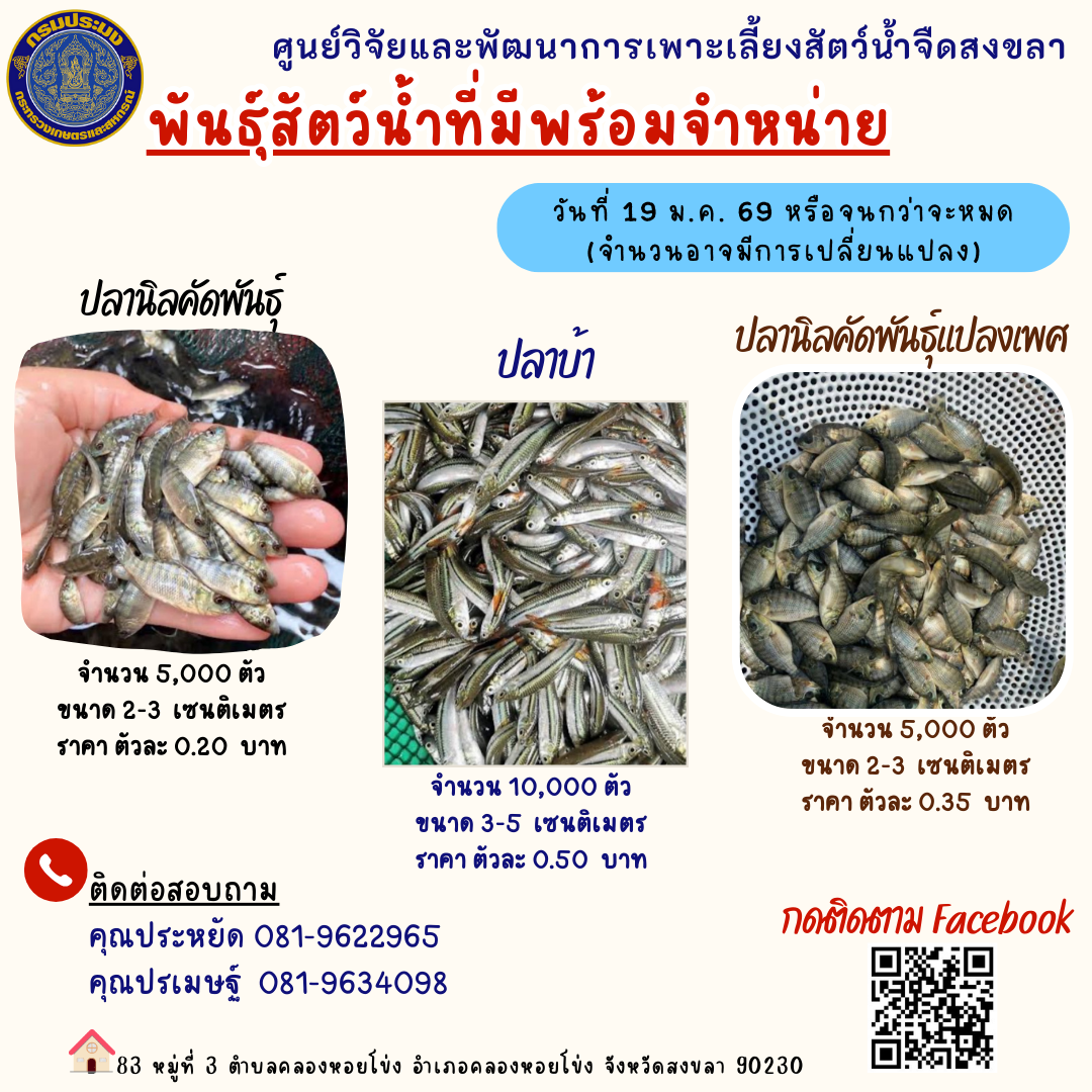 ศูนย์วิจัยและพัฒนาการเพาะเลี้ยงสัตว์น้ำจืดสงขลา จำหน่ายพันธุ์สัตว์น้ำ วันที่ 19 มกราคม 2569 นหรือจนกว่าจะหมด (จำนวนอาจมีการเปลี่ยนแปลง)