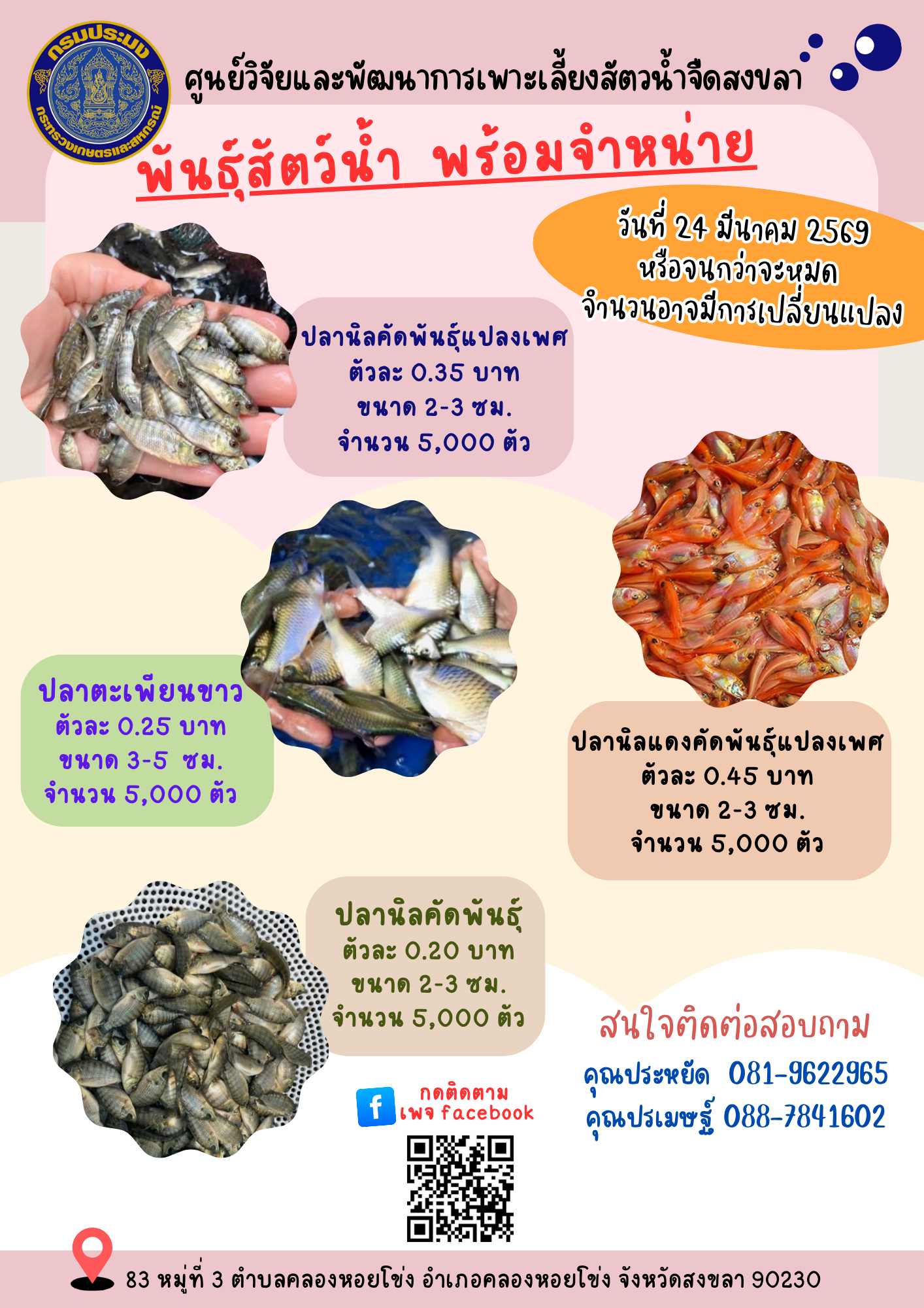 ศูนย์วิจัยและพัฒนาการเพาะเลี้ยงสัตว์น้ำจืดสงขลา จำหน่ายพันธุ์สัตว์น้ำ ประจำวันที่ 24 มีนาคม 2569 หรือจนกว่าจะหมด จำนวนอาจมีการเปลี่ยนแปลง