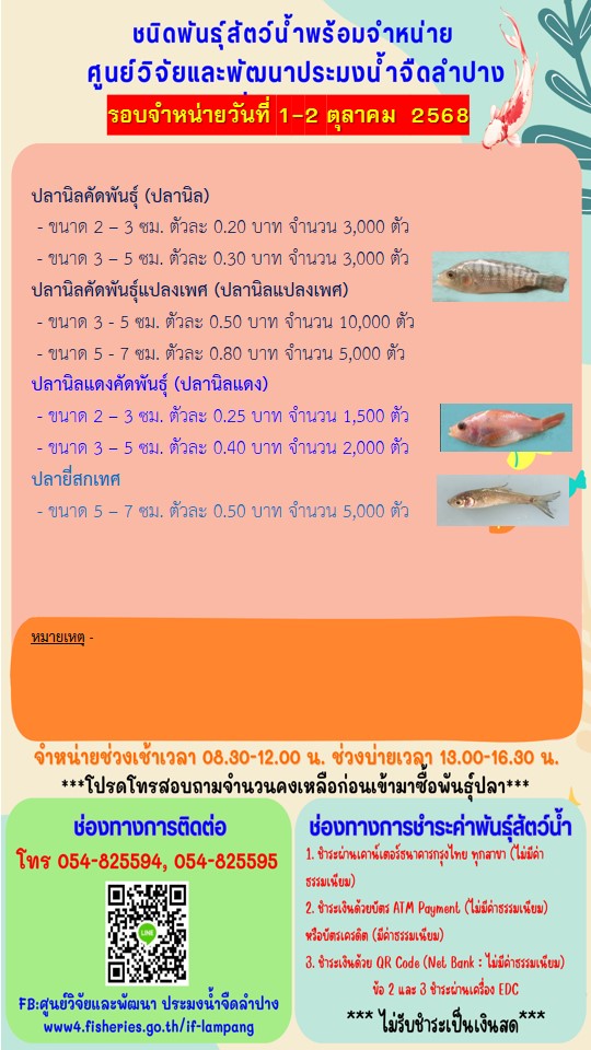 [2025-09-30] จำหน่ายพันธุ์ปลา.. [2025-09-29] No Gift.. [2025-09-17] สนับสนุนและปล่อยพันธุ์ปลา เนื่องในโอกาสมหามงคลเฉลิมพระชนมพรรษา และเนื่.. [2025-08-08] ถวายพระพร.. [2025-07-22] ปล่อยพันธุ์ปลารากกล้วยจินดา จำนวน 2,500 ตัว ปลามันหรือปลาเลียหิน จำนวน.. [2025-07-22] ติดตามตรวจสอบผลกระทบสิ่งแวดล้อม  โครงการอ่างเก็บน้ำแม่นึงอันเนื่องมาจา.. [2025-07-09] ประกาศกรมประมง เรื่อง รายชื่อผู้ผ่านการเลือกสรรเพื่อจัดจ้างเป็นพนักงาน.. [2025-06-13] ประกาศศูนย์วิจัยและพัฒนาประมงน้ำจืดลำปาง.. [2025-05-14] ร่วมประชุมเพื่อจัดทำแผนพัฒนา ด้านการประมง ในพื้นที่โครงการพัฒนาดอยตุง.. [2025-05-14] ร่วมพิธีทำบุญตักบาตร กิจกรรมส่งเสริมพระพุทธศาสนา เนื่องในเทศกาลวันวิสา.. อ่านทั้งหมด