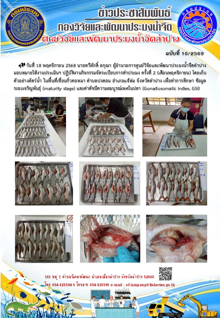 วันที่ 18 พฤศจิกายน 2568 นายทวีศักดิ์  สกุณา  ผู้อำนวยการศูนย์วิจัยและพัฒนาประมงน้ำจืดลำปาง มอบหมายให้งานประเมินฯ ปฏิบัติงานกิจกรรมจัดระเบียบการทำประมง ครั้งที่ 2 (เดือนพฤศจิกายน 2568) โดยเก็บตัวอย่างสัตว์น้ำในพื้นที่เขื่อนกิ่วคอหมา ตำบลปงดอน อำเภอแจ้ห่ม จังหวัดลำปาง เพื่อทำการศึกษาข้อมูลระยะเจริญพันธุ์ (maturity stage) และค่าดัชนีความสมบูรณ์เพศในปลา (Gonadosomatic Index, GSI)