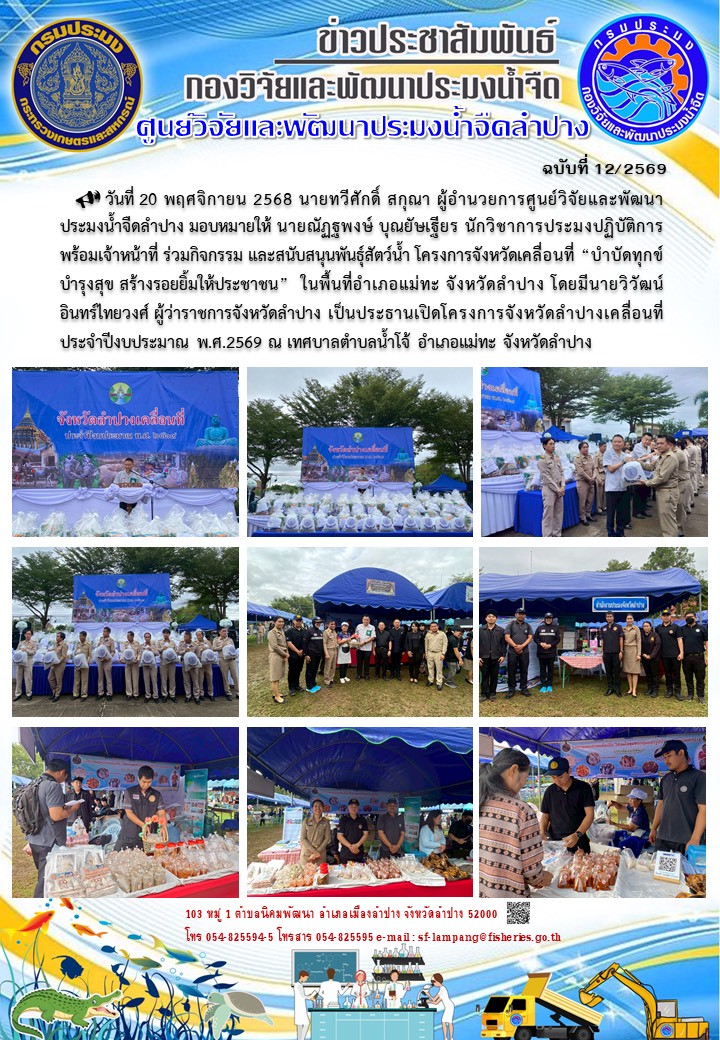 วันที่ 20 พฤศจิกายน 2568 นายทวีศักดิ์ สกุณา ผู้อำนวยการศูนย์วิจัยและพัฒนา   ประมงน้ำจืดลำปาง มอบหมายให้ นายณัฏฐพงษ์ บุณยัษเฐียร นักวิชาการประมงปฏิบัติการ พร้อมเจ้าหน้าที่ ร่วมกิจกรรม และสนับสนุนพันธุ์สัตว์น้ำ โครงการจังหวัดเคลื่อนที่ “บำบัดทุกข์ บำรุงสุข สร้างรอยยิ้มให้ประชาชน”  ในพื้นที่อำเภอแม่ทะ จังหวัดลำปาง โดยมีนายวิวัฒน์ อินทร์ไทยวงศ์ ผู้ว่าราชการจังหวัดลำปาง เป็นประธานเปิดโครงการจังหวัดลำปางเคลื่อนที่ ประจำปีงบประมาณ พ.ศ.2569 ณ เทศบาลตำบลน้ำโจ้ อำเภอแม่ทะ จังหวัดลำปาง