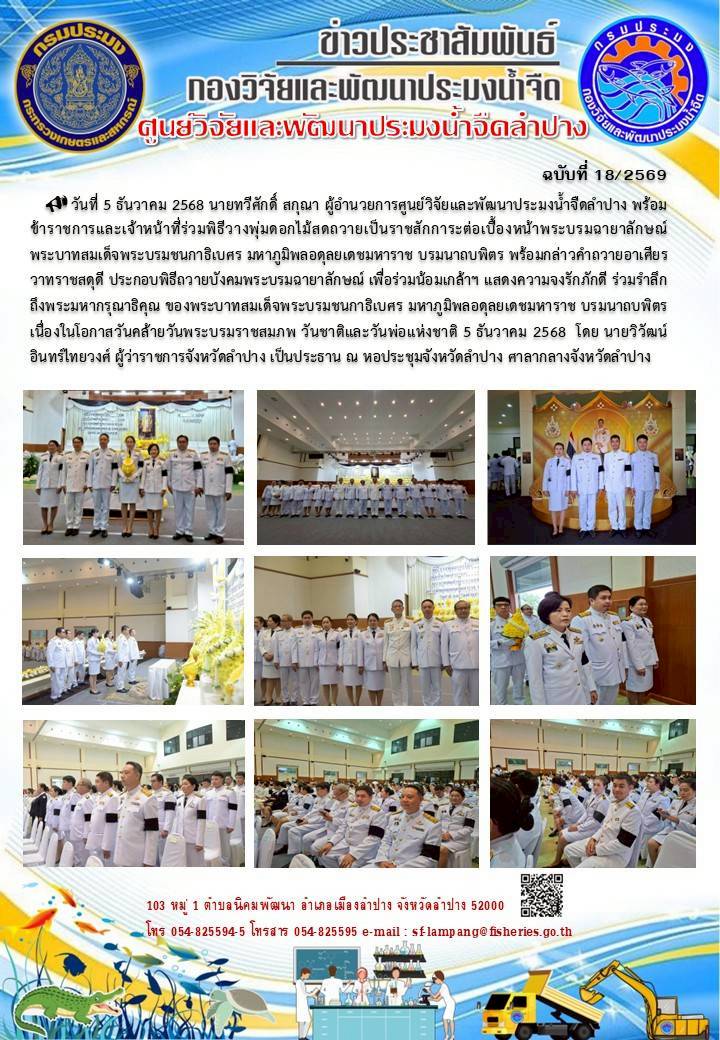 วันที่ 5 ธันวาคม 2568 นายทวีศักดิ์ สกุณา ผู้อำนวยการศูนย์วิจัยและพัฒนาประมงน้ำจืดลำปาง พร้อมข้าราชการและเจ้าหน้าที่ ร่วมพิธีวางพุ่มดอกไม้สดถวายเป็นราชสักการะต่อเบื้องหน้าพระบรมฉายาลักษณ์ พระบาทสมเด็จพระบรมชนกาธิเบศร มหาภูมิพลอดุลยเดชมหาราช บรมนาถบพิตร พร้อมกล่าวคำถวายอาเศียรวาทราชสดุดี ประกอบพิธีถวายบังคมพระบรมฉายาลักษณ์ เพื่อร่วมน้อมเกล้าฯ แสดงความจงรักภักดี ร่วมรำลึกถึงพระมหากรุณาธิคุณ ของพระบาทสมเด็จพระบรมชนกาธิเบศร มหาภูมิพลอดุลยเดชมหาราช บรมนาถบพิตร เนื่องในโอกาสวันคล้ายวันพระบรมราชสมภพ วันชาติและวันพ่อแห่งชาติ 5 ธันวาคม 2568  โดย นายวิวัฒน์ อินทร์ไทยวงศ์ ผู้ว่าราชการจังหวัดลำปาง เป็นประธาน ณ หอประชุมจังหวัดลำปาง ศาลากลางจังหวัดลำปาง