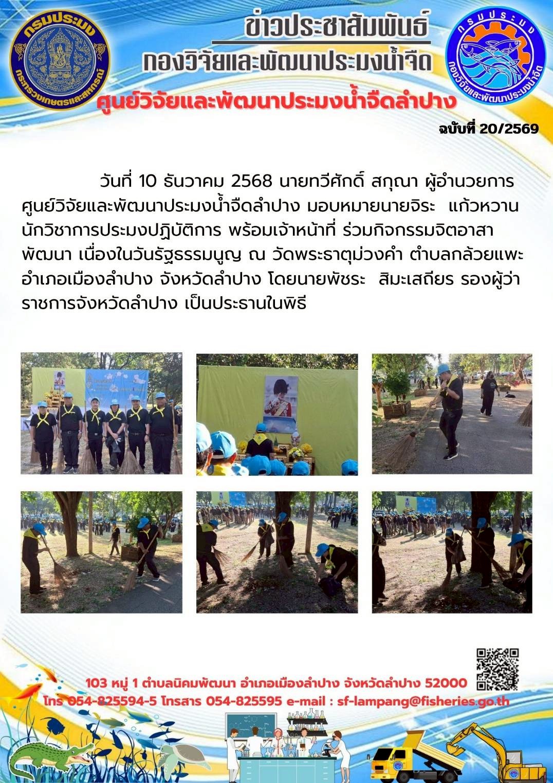 วันที่ 10 ธันวาคม 2568 นายทวีศักดิ์  สกุณา  ผู้อำนวยการศูนย์วิจัยและพัฒนาประมงน้ำจืดลำปาง มอบหมายนายจิระ  แก้วหวาน  นักวิชาการประมงปฏิบัติการ พร้อมเจ้าหน้าที่ ร่วมกิจกรรมจิตอาสาพ้ฒนา เนื่องในวันรัฐธรรมนูญ ณ วัดพระธาตุม่วงคำ ตำบลกล้วยแพะ อำเภอเมืองลำปาง จังหวัดลำปาง โดยนายพัชระ  สิมะเสถียร  รองผู้ว่าราชการจังหวัดลำปาง เป็นประธานในพิธี