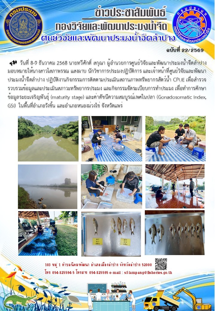 [2025-12-27] 22 - 24 ธันวาคม 2568 ประชุมชี้แจงโครงการบริหารจัดการทรัพยากรประมงน้ำจื.. [2025-12-27] 16-18 ธันวาคม 2568 ประชุมชี้แจงโครงการบริหารจัดการทรัพยากรประมงน้ำจืด.. [2025-12-27] ร่วมพิธีเปิดงานฤดูหนาวและของดีนครลำปาง ประจำปี 2569.. [2025-12-27] ร่วมพิธีบำเพ็ญกุศลปัญญาสมวาร 50 วัน.. [2025-12-27] ปฏิบัติงานประเมินทรัพยากรสัตว์น้ำ CPUE ครั้งที่ 1.. [2025-12-27] ประกาศกรมประมง เรื่อง บัญชีรายชื่อผู้ผ่านการเลือกสรรเพื่อจัดจ้างเป็นพน.. [2025-12-11] ร่วมกิจกรรมให้การช่วยเหลือเกษตรกรผู้ปลูกส้มเขียวหวานบ่อสี่เหลี่ยม.. [2025-12-11] ร่วมกิจกรรมจิตอาสาพ้ฒนา เนื่องในวันรัฐธรรมนูญ.. [2025-12-11] ร่วมพิธีวางพุ่มดอกไม้สดถวายเป็นราชสักการะต่อเบื้องหน้าพระบรมฉายาลักษณ์.. [2025-12-11] ต้อนรับนางฐิติพร  หลาวประเสริฐ  อธิบดีกรมประมง ในการตรวจเยี่ยมหน่วยงาน.. อ่านทั้งหมด