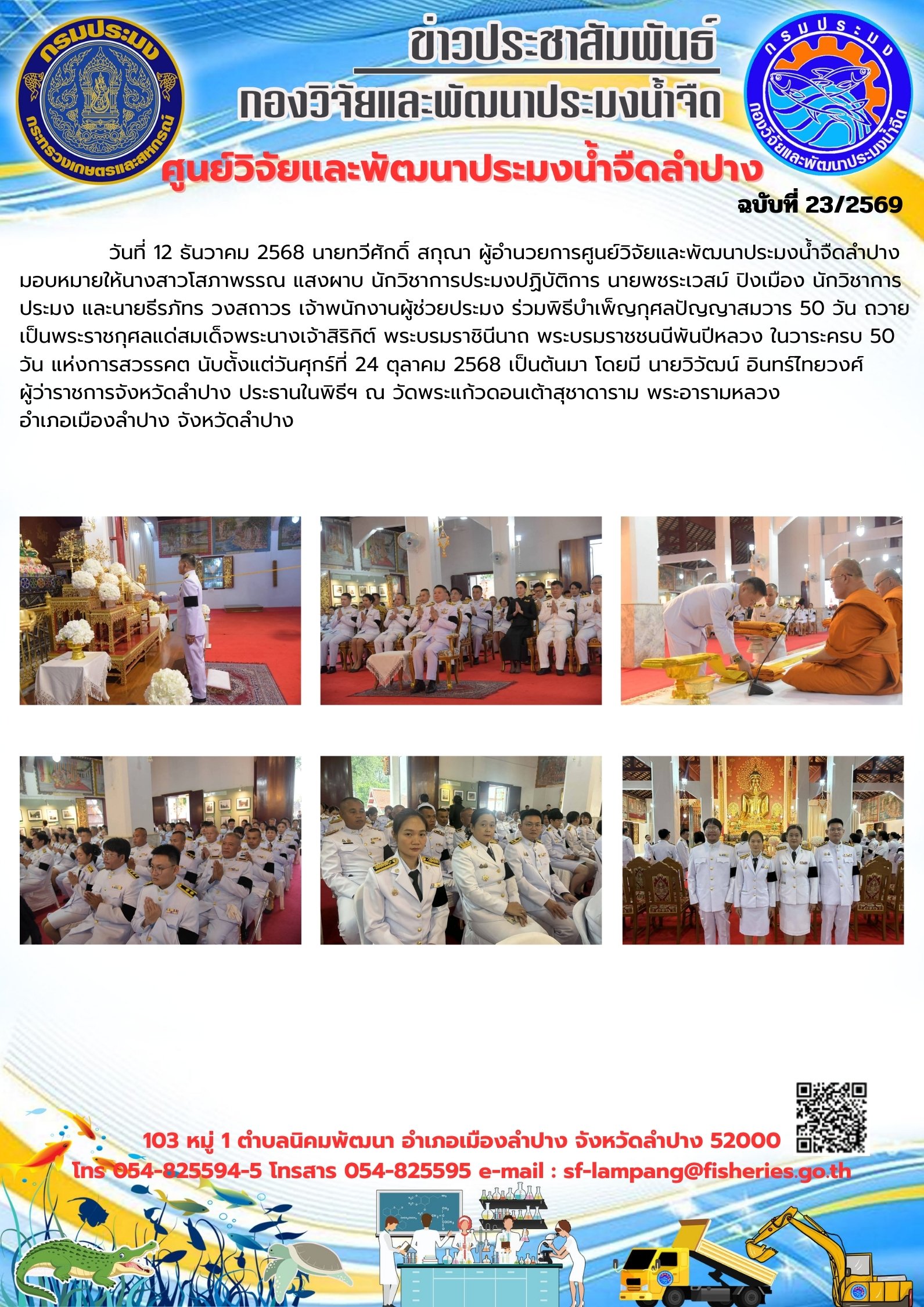 วันที่ 12 ธันวาคม 2568 นายทวีศักดิ์ สกุณา ผู้อำนวยการศูนย์วิจัยและพัฒนาประมงน้ำจืดลำปาง มอบหมายให้นางสาวโสภาพรรณ แสงผาบ นักวิชาการประมงปฏิบัติการ นายพชระเวสม์ ปิงเมือง นักวิชาการประมง และนายธีรภัทร วงสถาวร เจ้าพนักงานผู้ช่วยประมง ร่วมพิธีบำเพ็ญกุศลปัญญาสมวาร 50 วัน ถวายเป็นพระราชกุศลแด่สมเด็จพระนางเจ้าสิริกิต์ พระบรมราชินีนาถ พระบรมราชชนนีพันปีหลวง ในวาระครบ 50 วัน แห่งการสวรรคต นับต้ังแต่วันศุกร์ที่ 24 ตุลาคม 2568 เป็นต้นมา โดยมี นายวิวัฒน์ อินทร์ไทยวงศ์ ผู้ว่าราชการจังหวัดลำปาง ประธานในพิธีฯ ณ วัดพระแก้วดอนเต้าสุชาดาราม พระอารามหลวง อําเภอเมืองลําปาง จังหวัดลําปาง