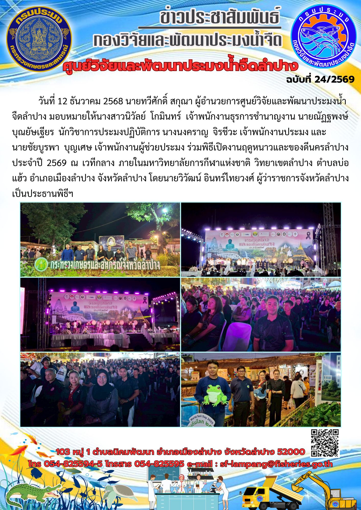 วันที่ 12 ธันวาคม 2568 นายทวีศักดิ์ สกุณา ผู้อำนวยการศูนย์วิจัยและพัฒนาประมงน้ำจืดลำปาง มอบหมายให้นางสาวนิวัลย์ โกมินทร์ เจ้าพนักงานธุรการชำนาญงาน นายณัฏฐพงษ์ บุณยัษเฐียร นักวิชาการประมงปฏิบัติการ นางนงคราญ จิรชีวะ เจ้าพนักงานประมง และนายชัยบูรพา บุญเศษ เจ้าพนักงานผู้ช่วยประมง ร่วมพิธีเปิดงานฤดูหนาวและของดีนครลำปาง ประจำปี 2569 ณ เวทีกลาง ภายในมหาวิทยาลัยการกีฬาแห่งชาติ วิทยาเขตลำปาง ตำบลบ่อแฮ้ว อําเภอเมืองลําปาง จังหวัดลําปาง โดยนายวิวัฒน์ อินทร์ไทยวงศ์ ผู้ว่าราชการจังหวัดลำปาง เป็นประธานพิธีฯ