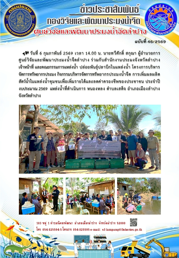 ปล่อยพันธุ์ปลาบึก โครงการการเพิ่มผลผลิตสัตว์น้ำในแหล่งน้ำชุมชนเพื่อเพิ่มรายได้และลดค่าครองชีพของประชาชน ประจำปีงบประมาณ 2569 ณ หนองหลง