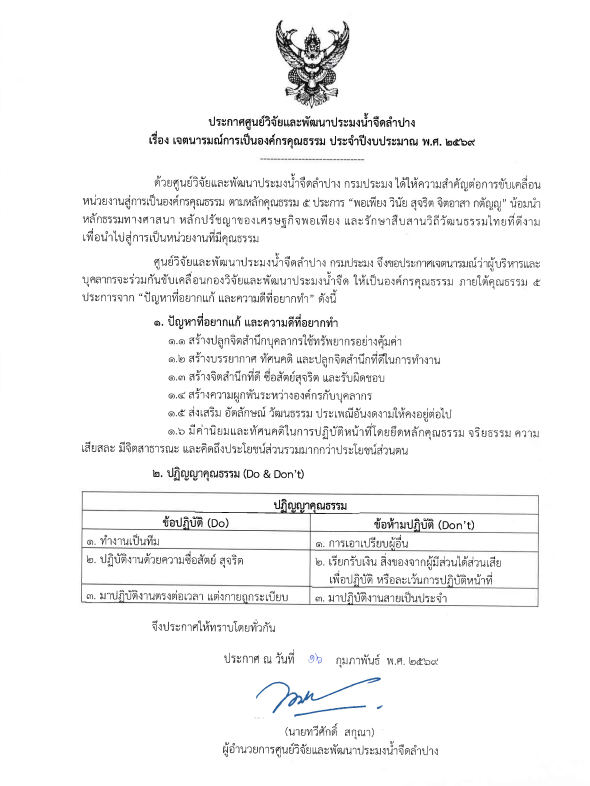 ประกาศเจตนารมณ์การเป็นองค์กรคุณธรรม ประจำปีงบประมาณ พ.ศ. 2569