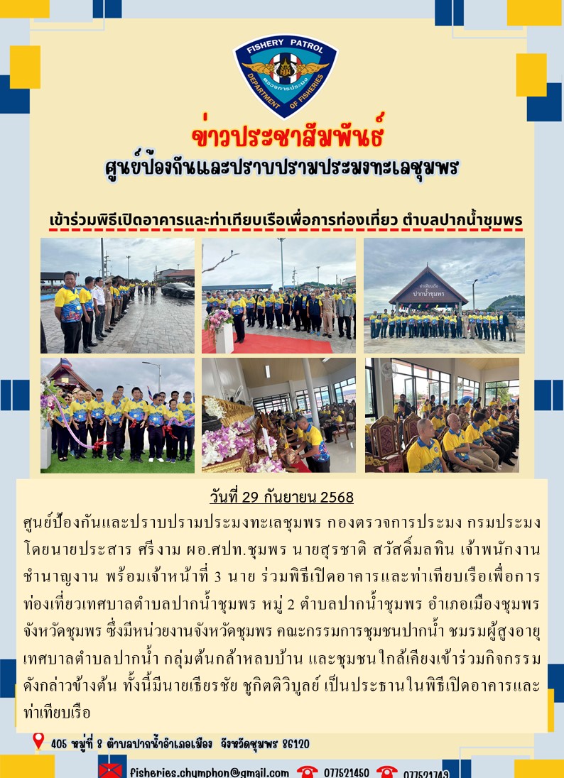 29 กันยายน 2568 ศูนย์ป้องกันและปราบปรามประมงทะเลชุมพร กองตรวจการประมง กรมประมง โดยนายประสาร ศรีงาม ผอ.ศปท.ชุมพร นายสุรชาติ สวัสดิ์มลทิน เจ้าพนักงานชำนาญงาน พร้อมเจ้าหน้าที่ 3 นาย ร่วมพิธีเปิดอาคารและท่าเทียบเรือเพื่อการท่องเที่ยวเทศบาลตำบลปากน้ำชุมพร หมู่ 2 ตำบลปากน้ำชุมพร อำเภอเมืองชุมพร จังหวัดชุมพร ซึ่งมีหน่วยงานจังหวัดชุมพร คณะกรรมการชุมชนปากน้ำ ชมรมผู้สูงอายุเทศบาลตำบลปากน้ำ กลุ่มต้นกล้าหลบบ้าน และชุมชนใกล้เคียงเข้าร่วมกิจกรรมดังกล่าวข้างต้น ทั้งนี้มีนายเธียรชัย ชูกิตติวิบูลย์ เป็นประธานในพิธีเปิดอาคารและท่าเทียบเรือ