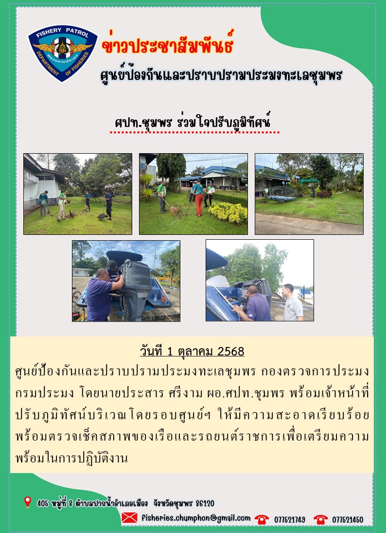ศูนย์ป้องกันและปราบปรามประมงทะเลชุมพร กองตรวจการประมง กรมประมง โดยนายประสาร ศรีงาม ผอ.ศปท.ชุมพร พร้อมเจ้าหน้าที่ปรับภูมิทัศน์บริเวณโดยรอบศูนย์ฯ ให้มีความสะอาดเรียบร้อย พร้อมตรวจเช็คสภาพของเรือและรถยนต์ราชการเพื่อเตรียมความพร้อมในการปฏิบัติงาน