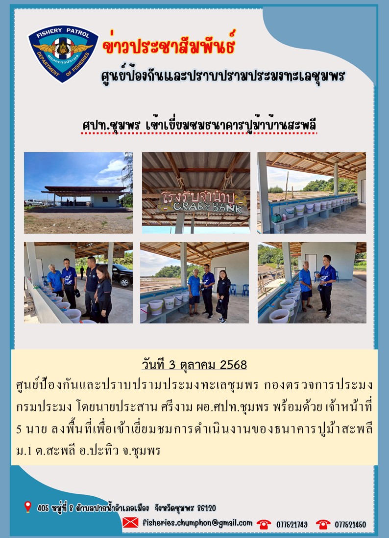 ศูนย์ป้องกันและปราบปรามประมงทะเลชุมพร กองตรวจการประมง กรมประมง โดยนายประสาน ศรีงาม ผอ.ศปท.ชุมพร พร้อมด้วย เจ้าหน้าที่ 5 นาย ลงพื้นที่เพื่อเข้าเยี่ยมชมการดำเนินงานของธนาคารปูม้าสะพลี ม.1 ต.สะพลี อ.ปะทิว จ.ชุมพร