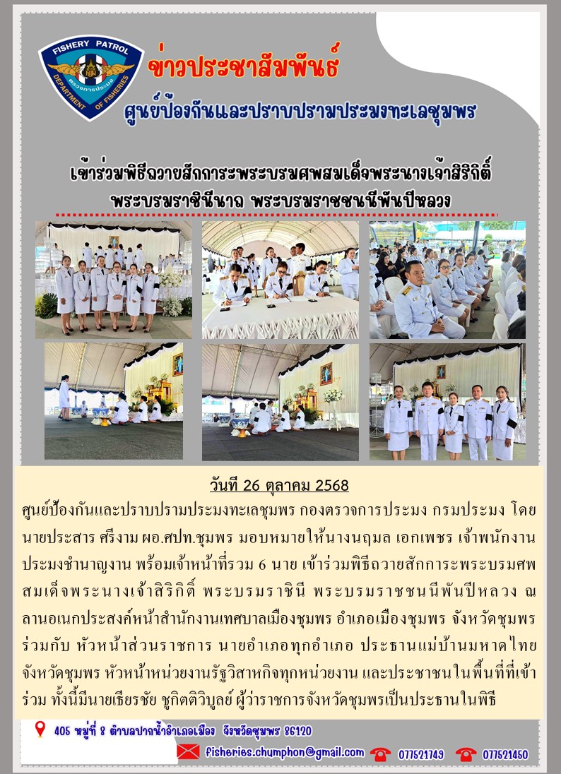 26 ตุลาคม 2568 ศูนย์ป้องกันและปราบปรามประมงทะเลชุมพร กองตรวจการประมง กรมประมง โดยนายประสาร ศรีงาม ผอ.ศปท.ชุมพร มอบหมายให้นางนฤมล เอกเพชร เจ้าพนักงานประมงชำนาญงาน พร้อมเจ้าหน้าที่รวม 6 นาย เข้าร่วมพิธีถวายสักการะพระบรมศพสมเด็จพระนางเจ้าสิริกิติ์ พระบรมราชินี พระบรมราชชนนีพันปีหลวง ณ ลานอเนกประสงค์หน้าสำนักงานเทศบาลเมืองชุมพร อำเภอเมืองชุมพร จังหวัดชุมพร ร่วมกับ หัวหน้าส่วนราชการ นายอำเภอทุกอำเภอ ประธานแม่บ้านมหาดไทยจังหวัดชุมพร หัวหน้าหน่วยงานรัฐวิสาหกิจทุกหน่วยงาน และประชาชนในพื้นที่ที่เข้าร่วม ทั้งนี้มีนายเธียรชัย ชูกิตติวิบูลย์ ผู้ว่าราชการจังหวัดชุมพรเป็นประธานในพิธี