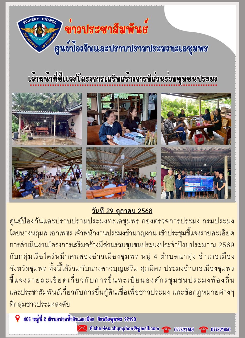 ศูนย์ป้องกันและปราบปรามประมงทะเลชุมพร กองตรวจการประมง กรมประมง โดยนางนฤมล เอกเพชร เจ้าพนักงานประมงชำนาญงาน เข้าประชุมชี้แจงรายละเอียดการดำเนินงานโครงการเสริมสร้างมีส่วนร่วมชุมชนประมงประจำปีงบประมาณ 2569 กับกลุ่มเรือไดร์หมึกคนสองอ่าวเมืองชุมพร หมู่ 4 ตำบลนาทุ่ง อำเภอเมือง จังหวัดชุมพร ทั้งนี้ได้ร่วมกับนางสาวบุญเสริม ศุภมิตร ประมงอำเภอเมืองชุมพร ชี้แจงรายละเอียดเกี่ยวกับการขึ้นทะเบียนองค์กรชุมชนประมงท้องถิ่น และประชาสัมพันธ์เกี่ยวกับการยื่นกู้สินเชื่อเพื่อชาวประมง และข้อกฎหมายต่างๆที่กลุ่มชาวประมงสงสัย