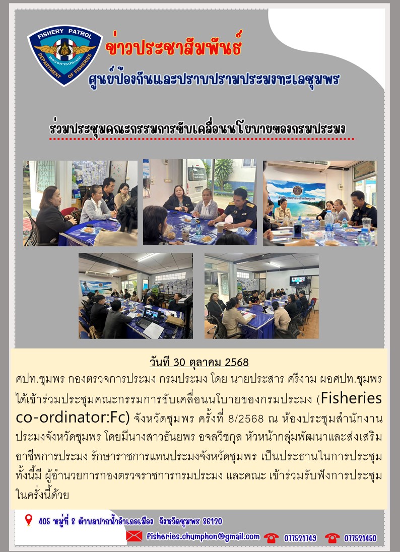 วันที่ 30 ตุลาคม 2568 ศปท.ชุมพร กองตรวจการประมง กรมประมง โดย นายประสาร ศรีงาม ผอศปท.ชุมพร ได้เข้าร่วมประชุมคณะกรรมการขับเคลื่อนนโบายของกรมประมง (Fisheries co-ordinator:Fc) จังหวัดชุมพร ครั้งที่ 8/2568 ณ ห้องประชุมสำนักงานประมงจังหวัดชุมพร โดยมีนางสาวธันยพร อจลวิชกุล หัวหน้ากลุ่มพัฒนาและส่งเสริมอาชีพการประมง รักษาราชการแทนประมงจังหวัดชุมพร เป็นประธานในการประชุม ทั้งนี้มี ผู้อำนวยการกองตรวจราชการกรมประมง และคณะ เข้าร่วมรับฟังการประชุมในครั่งนี้ด้วย