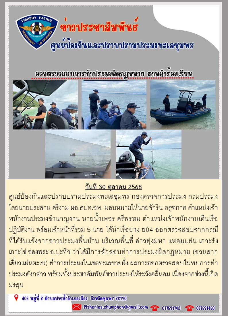 วันที่ 30 ตุลาคม 2568 ศูนย์ป้องกันและปราบปรามประมงทะเลชุมพร กองตรวจการประมง กรมประมง โดยนายประสาน ศรีงาม ผอ.ศปท.ชพ. มอบหมายให้นายจักริน ครุฑกาศ ตำแหน่งเจ้าพนักงานประมงชำนาญงาน นายน้ำเพชร ศรีพรหม ตำแหน่งเจ้าพนักงานเดินเรือปฏิบัติงาน พร้อมเจ้าหน้าที่รวม 6 นาย ได้นำเรือยาง ย04 ออกตรวจสอบจากกรณีที่ได้รับแจ้งจากชาวประมงพื้นบ้าน บริเวณพื้นที่ อ่าวทุ่งมหา แหลมแท่น เกาะรัง เกาะไข่ ช่องพระ อ.ปะทิว ว่าได้มีการลักลอบทำการประมงผิดกฏหมาย (อวนลากเดี่ยวแผ่นตะเฆ่) ทำการประมงในเขตทะเลชายฝั่ง