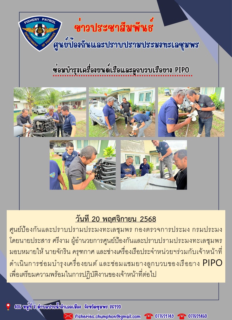 ศูนย์ป้องกันและปราบปรามประมงทะเลชุมพร กองตรวจการประมง กรมประมง โดยนายประสาร ศรีงาม ผู้อำนวยการศูนย์ป้องกันและปราบปรามประมงทะเลชุมพร มอบหมายให้ นายจักริน ครุฑกาศ และช่างเครื่องเรือประจำหน่วยฯร่วมกับเจ้าหน้าที่ ดำเนินการซ่อมบำรุงเครื่องยนต์ และซ่อมแซมยางลูกบวบของเรือยาง PIPO เพื่อเตรียมความพร้อมในการปฏิบัติงานของเจ้าหน้าที่ต่อไป