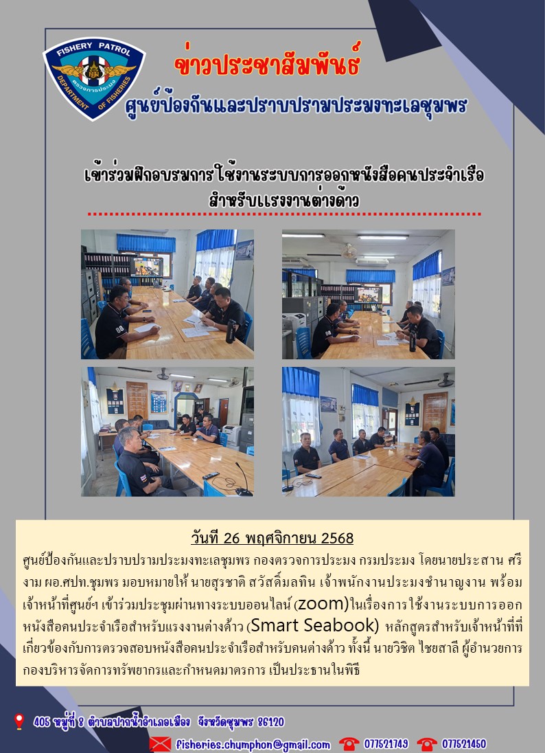 วันที่ 26 พฤศจิกายน 2568 ศูนย์ป้องกันและปราบปรามประมงทะเลชุมพร กองตรวจการประมง กรมประมง โดยนายประสาน ศรีงาม ผอ.ศปท.ชุมพร มอบหมายให้ นายสุรชาติ สวัสดิ์มลทิน เจ้าพนักงานประมงชำนาญงาน พร้อมเจ้าหน้าที่ศูนย์ฯ เข้าร่วมประชุมผ่านทางระบบออนไลน์ (zoom) ในเรื่องการใช้งานระบบการออกหนังสือคนประจำเรือสำหรับเเรงงานต่างด้าว (Smart Seabook) หลักสูตรสำหรับเจ้าหน้าที่ที่เกี่ยวข้องกับการตรวจสอบหนังสือคนประจำเรือสำหรับคนต่างด้าว ทั้งนี้ นายวิชิต ไชยสาลี ผู้อำนวยการกองบริหารจัดการทรัพยากรเเละกำหนดมาตรการ เป็นประธานในพิธี