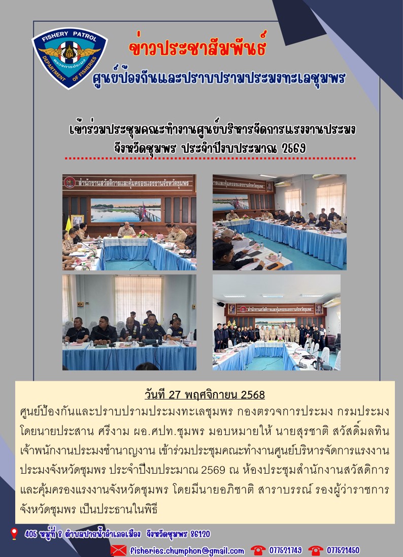 วันที่ 27 พฤศจิกายน 2568 ศูนย์ป้องกันและปราบปรามประมงทะเลชุมพร กองตรวจการประมง กรมประมง โดยนายประสาน ศรีงาม ผอ.ศปท.ชุมพร มอบหมายให้ นายสุรชาติ สวัสดิ์มลทิน เจ้าพนักงานประมงชำนาญงาน เข้าร่วมประชุมคณะทำงานศูนย์บริหารจัดการแรงงานประมงจังหวัดชุมพร ประจำปีงบประมาณ 2569 ณ ห้องประชุมสำนักงานสวัสดิการและคุ้มครองแรงงานจังหวัดชุมพร โดยมีนายอภิชาติ สาราบรรณ์ รองผู้ว่าราชการจังหวัดชุมพร เป็นประธานในพิธี