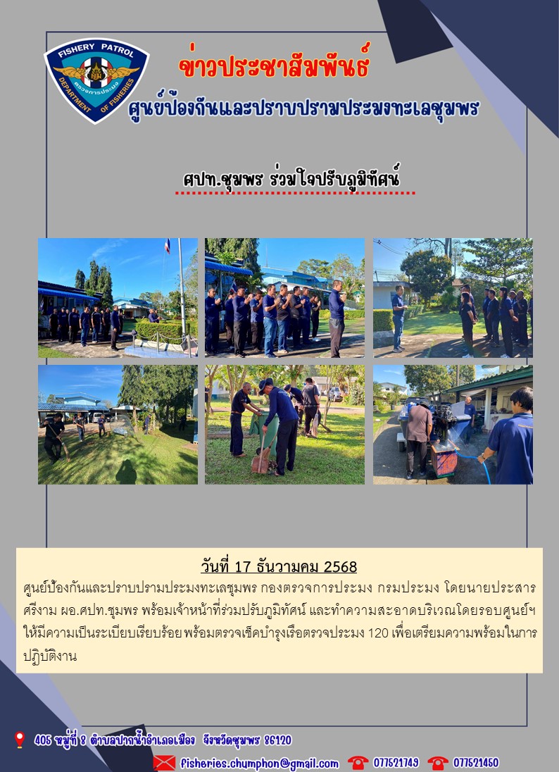 วันที่ 17 ธันวาคม 2568 ศูนย์ป้องกันและปราบปรามประมงทะเลชุมพร กองตรวจการประมง กรมประมง โดยนายประสาร ศรีงาม ผอ.ศปท.ชุมพร พร้อมเจ้าหน้าที่ประจำศูนย์ฯ เข้าแถวเครพธงชาติ สวดมนต์ไหว้พระ พร้อมรับฟังแนวทางการปฏิบัติงานจากผู้อำนวยการ ศปท.ชุมพร และร่วมกันปรับภูมิทัศน์ทำความสะอาดบริเวณโดยรอบศูนย์ฯ ให้มีความเป็นระเบียบเรียบร้อย พร้อมตรวจเช็คบำรุงเรือตรวจประมง 120 เพื่อเตรียมความพร้อมในการปฏิบัติงาน