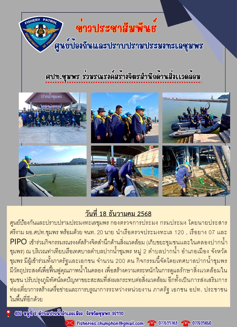วันที่ 18 ธันวาคม 2568 ศูนย์ป้องกันเเละปราบปรามประมงทะเลชุมพร กองตรวจการประมง กรมประมง โดยนายประสาร ศรีงาม ผอ.ศปท.ชุมพร พร้อมด้วย จนท. 20 นาย นำเรือตรวจประมงทะเล 120 , เรือยาง 07 เเละ PIPO เข้าร่วมกิจกรรมรณรงงค์สร้างจิตสำนึกด้านสิ่งเเวดล้อม (เก็บขยะชุมชนเเละในคลองปากน้ำชุมพร) ณ บริเวณท่าเทียบเรือเทศบาลตำบลปากน้ำชุมพร หมู่ 2 ตำบลปากน้ำ อำเภอเมือง จังหวัดชุมพร มีผู้เข้าร่วมทั้งภาครัฐเเละเอกชน จำนวน 200 คน กิจกรรมนี้จัดโดยเทศบาลปากน้ำชุมพร มีวัตถุประสงค์เพื่อฟื้นฟูคุณภาพน้ำในคลอง เพื่อสร้างความตระหนักในการดูเเลรักษาสิ่งเเวดล้อมในชุมชน ปรับปรุงภูมิทัศน์ลดปัญหาขยะสะสมที่ส่งผลกระทบต่อสิ่งเเวดล้อม อีกทั้งเป็นการส่งเสริมการท่องเที่ยวการสร้างเครื่อข่ายเเละการบรูณาการระหว่างหน่วยงาน ภาครัฐ เอกชน อปท. ประชาชนในพื้นที่อีกด้วย