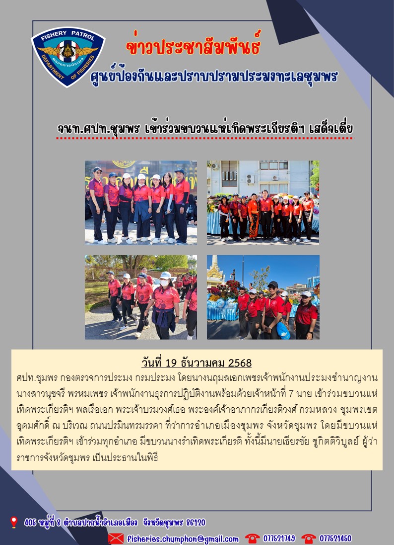 วันที่ 19 ธันวาคม 2568 ศปท.ชุมพร กองตรวจการประมง กรมประมง โดยนางนฤมลเอกเพชรเจ้าพนักงานประมงชำนาญงาน นางสาวนุชจรี พรหมเพชร เจ้าพนักงานธุรการปฏิบัติงานพร้อมด้วยเจ้าหน้าที่ 7 นาย เข้าร่วมขบวนแห่เทิดพระเกียรติฯ พลเรือเอก พระเจ้าบรมวงศ์เธอ พระองค์เจ้าอาภากรเกียรติวงศ์ กรมหลวง ชุมพรเขตอุดมศักดิ์ ณ บริเวณ ถนนปรมินทรมรรคา ที่ว่าการอำเภอเมืองชุมพร จังหวัดชุมพร โดยมีขบวนแห่เทิดพระเกียรติฯ เข้าร่วมทุกอำเภอ มีขบวนนางรำเทิดพระเกียรติ ทั้งนี้มีนายเธียรชัย ชูกิตติวิบูลย์ ผู้ว่าราชการจังหวัดชุมพร เป็นประธานในพิธี
