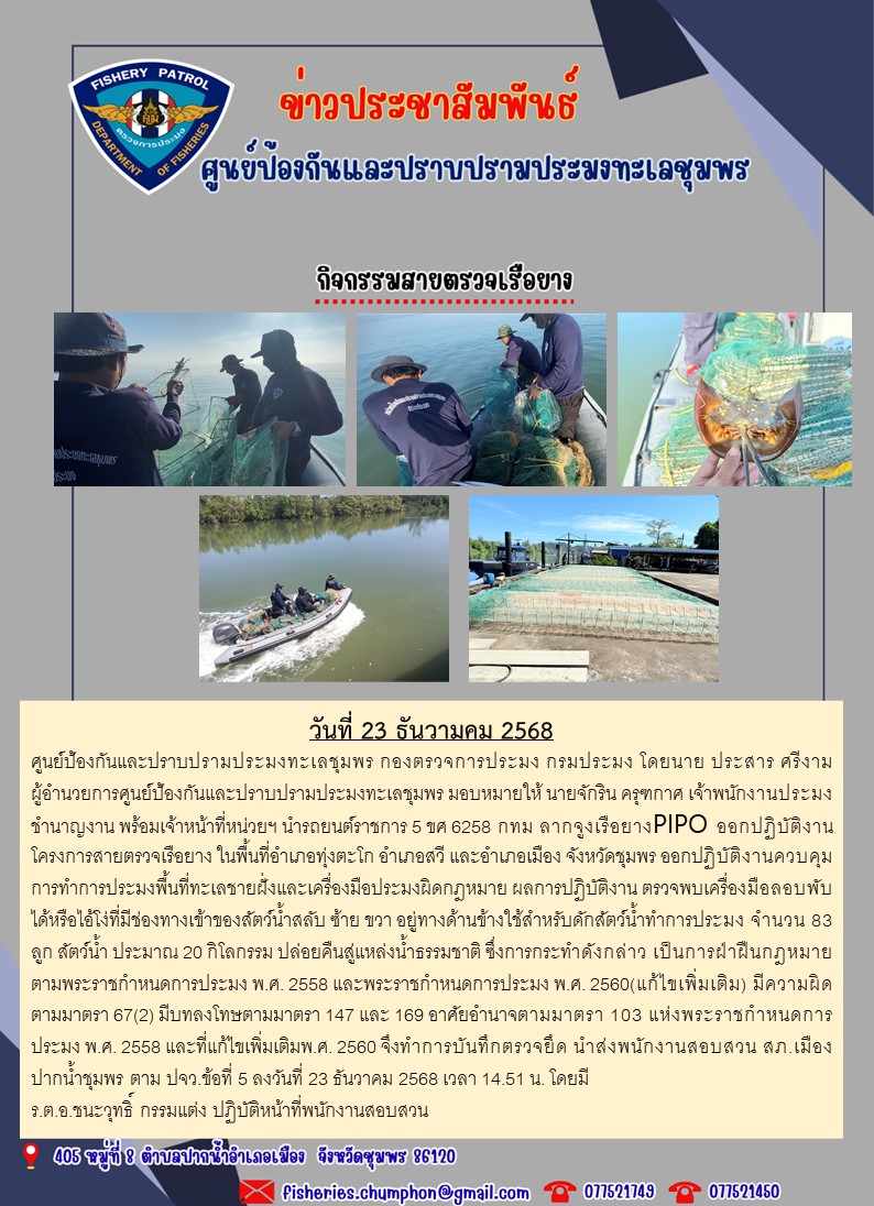ศูนย์ป้องกันและปราบปรามประมงทะเลชุมพร กองตรวจการประมง กรมประมง โดยนาย ประสาร ศรีงาม ผู้อำนวยการศูนย์ป้องกันและปราบปรามประมงทะเลชุมพร มอบหมายให้ นายจักริน ครุฑกาศ เจ้าพนักงานประมงชำนาญงาน พร้อมเจ้าหน้าที่หน่วยฯ นำรถยนต์ราชการ 5 ขศ 6258 กทม ลากจูงเรือยางPIPO ออกปฏิบัติงานโครงการสายตรวจเรือยาง ในพื้นที่อำเภอทุ่งตะโก อำเภอสวี และอำเภอเมือง จังหวัดชุมพร ออกปฏิบัติงานควบคุมการทำการประมงพื้นที่ทะเลชายฝั่งและเครื่องมือประมงผิดกฎ