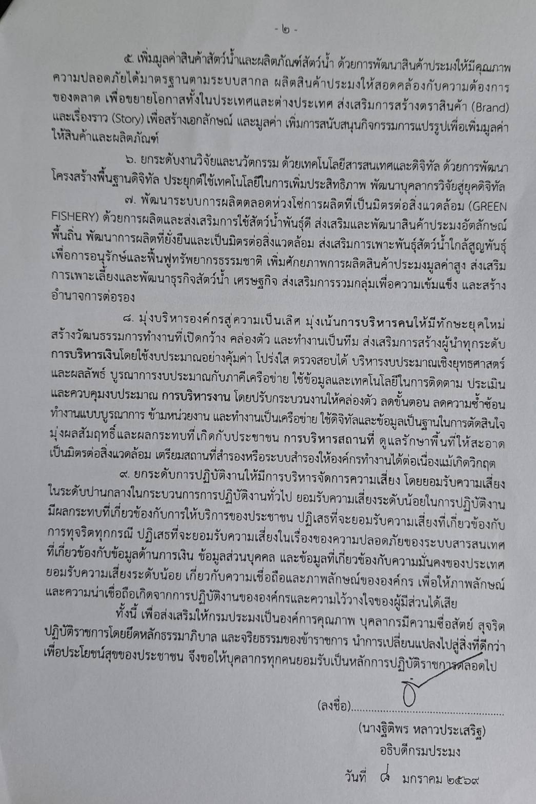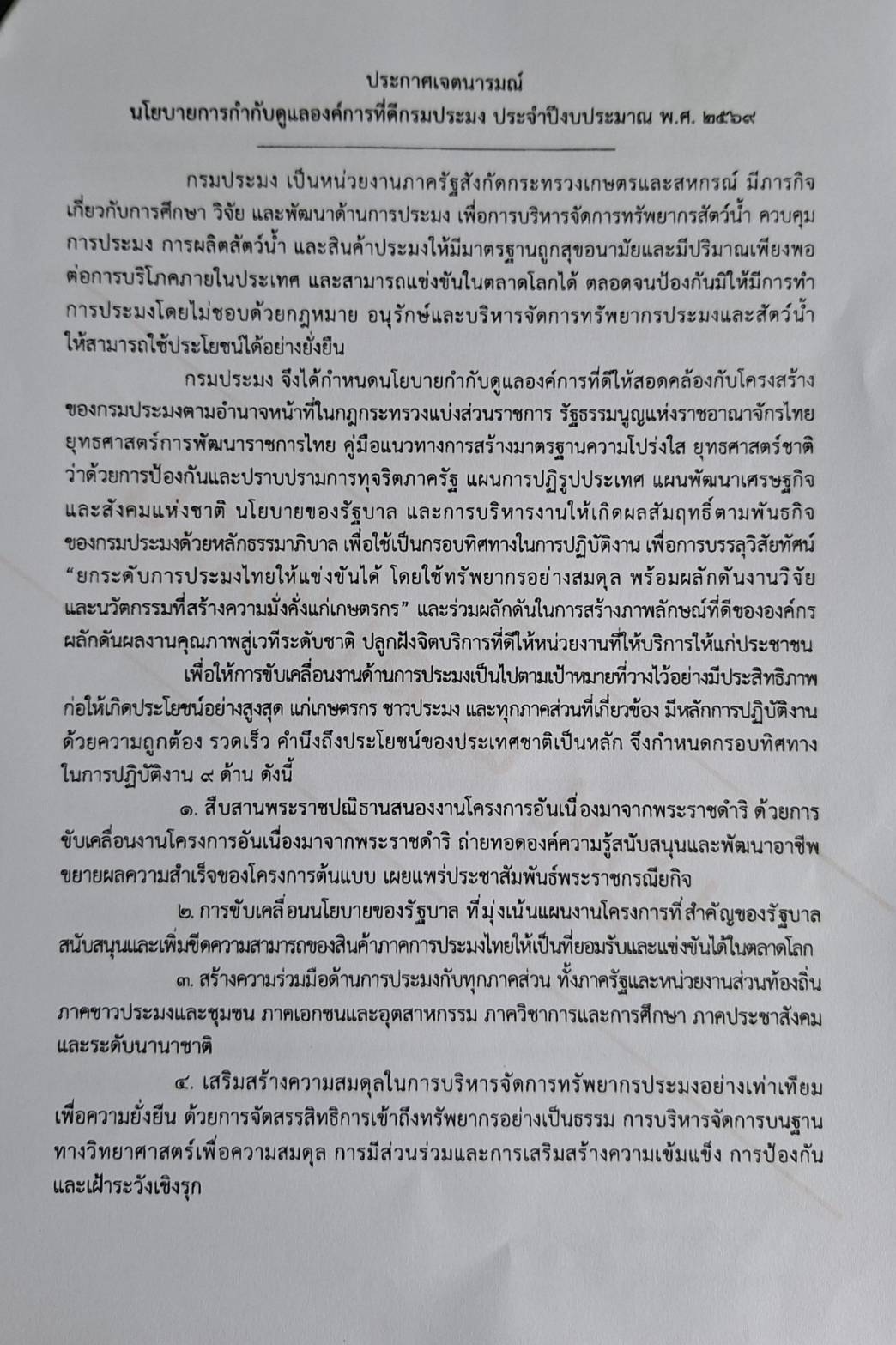 นโยบายการกำกับดูเเลองค์การที่ดี กรมประมง ประจำปีงบประมาณ พ.ศ.2569