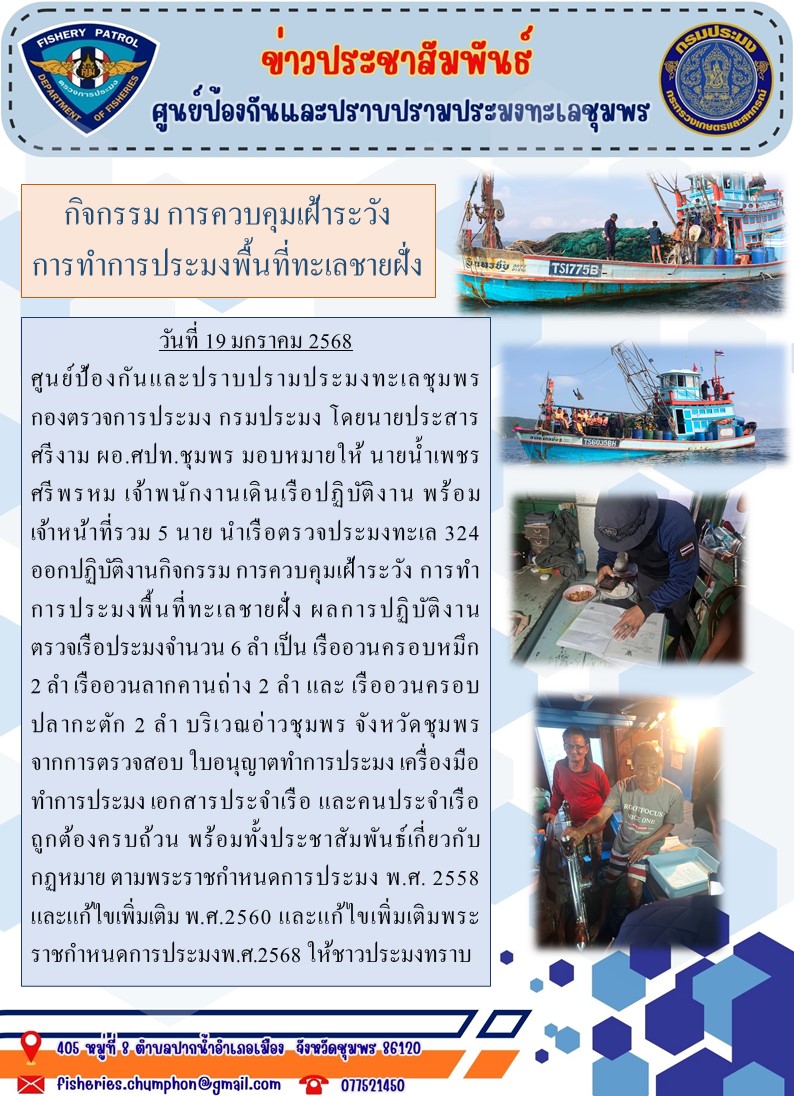 วันที่ 19 มกราคม 2568 ศูนย์ป้องกันและปราบปรามประมงทะเลชุมพร กองตรวจการประมง กรมประมง โดยนายประสาร ศรีงาม ผอ.ศปท.ชุมพร มอบหมายให้ นายน้ำเพชร ศรีพรหม เจ้าพนักงานเดินเรือปฏิบัติงาน พร้อมเจ้าหน้าที่รวม 5 นาย นำเรือตรวจประมงทะเล 324 ออกปฏิบัติงานกิจกรรม การควบคุมเฝ้าระวัง การทำการประมงพื้นที่ทะเลชายฝั่ง ผลการปฏิบัติงาน ตรวจเรือประมงจำนวน 6 ลำ เป็น เรืออวนครอบหมึก 2 ลำ เรืออวนลากคานถ่าง 2 ลำ และ เรืออวนครอบปลากะตัก 2 ลำ บริเวณอ่าวชุมพร จังหวัดชุมพร จากการตรวจสอบ ใบอนุญาตทำการประมง เครื่องมือทำการประมง เอกสารประจำเรือ และคนประจำเรือ ถูกต้องครบถ้วน พร้อมทั้งประชาสัมพันธ์เกี่ยวกับกฏหมาย ตามพระราชกำหนดการประมง พ.ศ. 2558 และแก้ไขเพิ่มเติม พ.ศ.2560 และแก้ไขเพิ่มเติมพระราชกำหนดการประมงพ.ศ.2568 ให้ชาวประมงทราบ