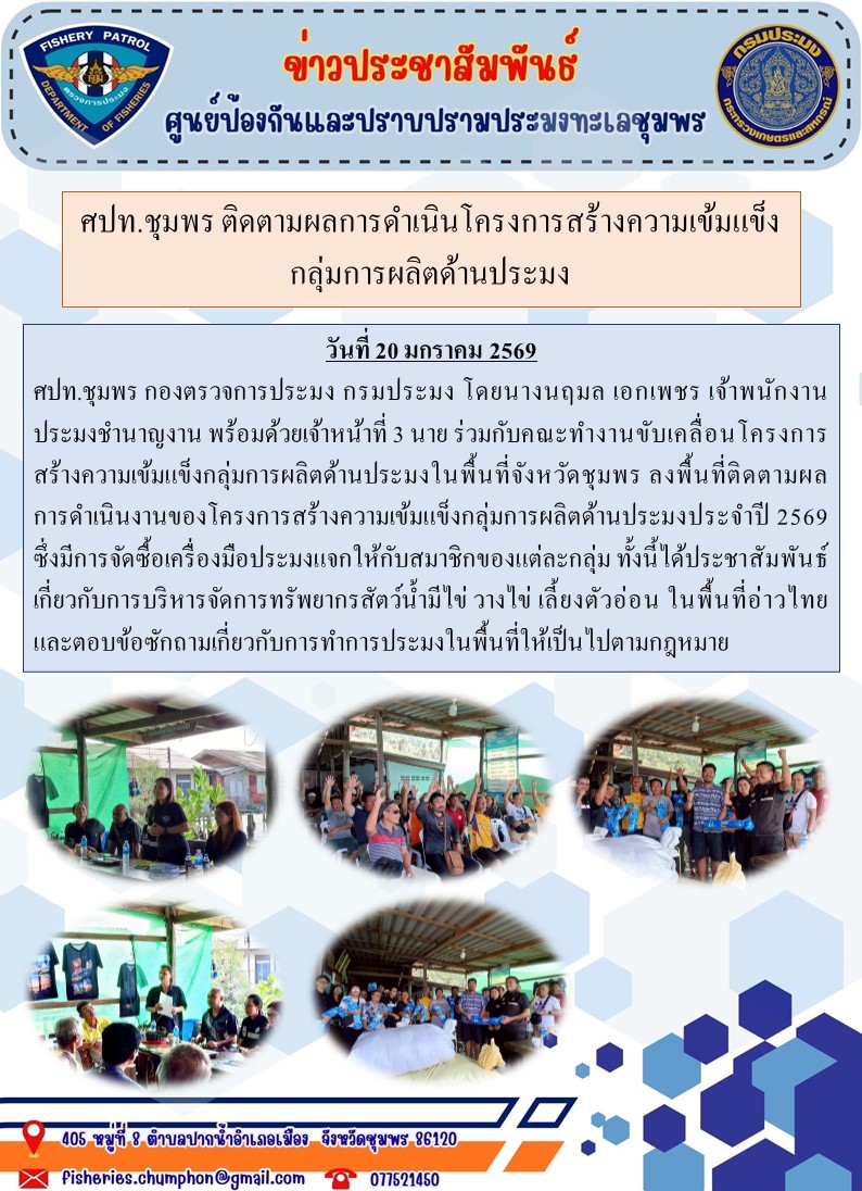 วันที่ 20 มกราคม 2569 ศปท.ชุมพร กองตรวจการประมง กรมประมง โดยนางนฤมล เอกเพชร เจ้าพนักงานประมงชำนาญงาน พร้อมด้วยเจ้าหน้าที่ 3 นาย ร่วมกับคณะทำงานขับเคลื่อนโครงการสร้างความเข้มแข็งกลุ่มการผลิตด้านประมงในพื้นที่จังหวัดชุมพร ลงพื้นที่ติดตามผลการดำเนินงานของโครงการสร้างความเข้มแข็งกลุ่มการผลิตด้านประมงประจำปี 2569 ซึ่งมีการจัดซื้อเครื่องมือประมงแจกให้กับสมาชิกของแต่ละกลุ่ม ทั้งนี้ได้ประชาสัมพันธ์เกี่ยวกับการบริหารจัดการทรัพยากรสัตว์น้ำมีไข่ วางไข่ เลี้ยงตัวอ่อน ในพื้นที่อ่าวไทยและตอบข้อซักถามเกี่ยวกับการทำการประมงในพื้นที่ให้เป็นไปตามกฎหมาย