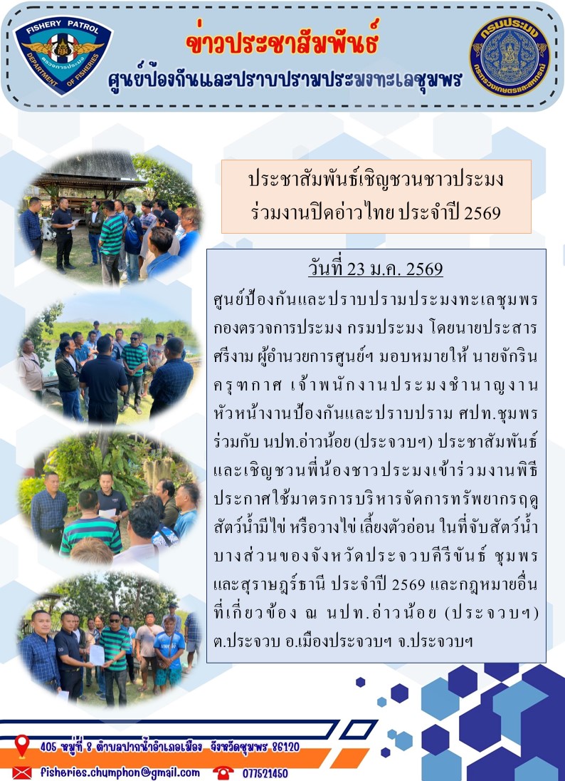 วันที่ 23 ม.ค. 2569 ศูนย์ป้องกันและปราบปรามประมงทะเลชุมพร กองตรวจการประมง กรมประมง โดยนายประสาร ศรีงาม ผู้อำนวยการศูนย์ฯ มอบหมายให้ นายจักริน ครุฑกาศ เจ้าพนักงานประมงชำนาญงาน หัวหน้างานป้องกันและปราบปราม ศปท.ชุมพร ร่วมกับ นปท.อ่าวน้อย (ประจวบฯ) ประชาสัมพันธ์ และเชิญชวนพี่น้องชาวประมงเข้าร่วมงานพิธีประกาศใช้มาตรการบริหารจัดการทรัพยากรฤดูสัตว์น้ำมีไข่ หรือวางไข่ เลี้ยงตัวอ่อน ในที่จับสัตว์น้ำบางส่วนของจังหวัดประจวบคีรีขันธ์ ชุมพร และสุราษฎร์ธานี ประจำปี 2569 และกฎหมายอื่นที่เกี่ยวข้อง ณ นปท.อ่าวน้อย (ประจวบฯ) ต.ประจวบ อ.เมืองประจวบฯ จ.ประจวบฯ