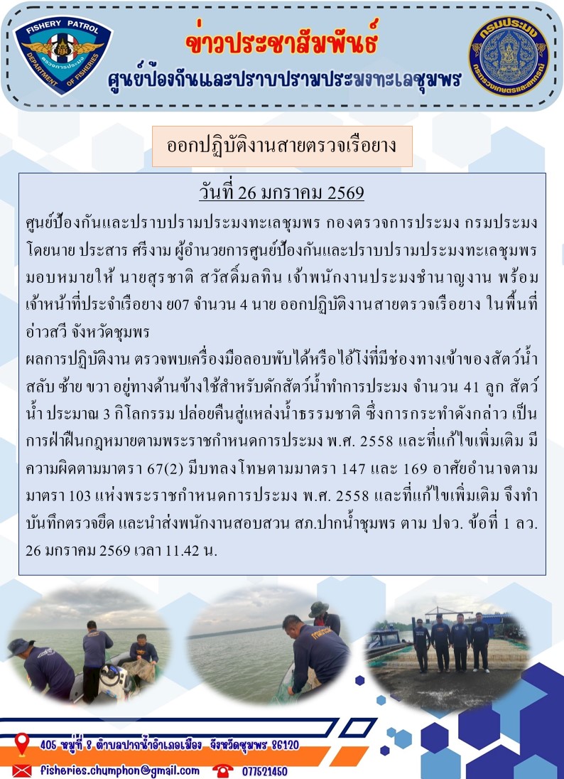 ผลการปฏิบัติงาน ตรวจพบเครื่องมือลอบพับได้หรือไอ้โง่ที่มีช่องทางเข้าของสัตว์น้ำสลับ ซ้าย ขวา อยู่ทางด้านข้างใช้สำหรับดักสัตว์น้ำทำการประมง จำนวน 41 ลูก สัตว์น้ำ ประมาณ 3 กิโลกรรม ปล่อยคืนสู่แหล่งน้ำธรรมชาติ ซึ่งการกระทำดังกล่าว เป็นการฝ่าฝืนกฎหมายตามพระราชกำหนดการประมง พ.ศ. 2558 และที่แก้ไขเพิ่มเติม มีความผิดตามมาตรา 67(2) มีบทลงโทษตามมาตรา 147 และ 169 อาศัยอำนาจตามมาตรา 103 แห่งพระราชกำหนดการประมง พ.ศ. 2558 และที่แก้ไขเพิ่มเติม จึงทำบันทึกตรวจยึด และนำส่งพนักงานสอบสวน สภ.ปากน้ำชุมพร ตาม ปจว. ข้อที่ 1 ลว. 26 มกราคม 2569 เวลา 11.42 น.