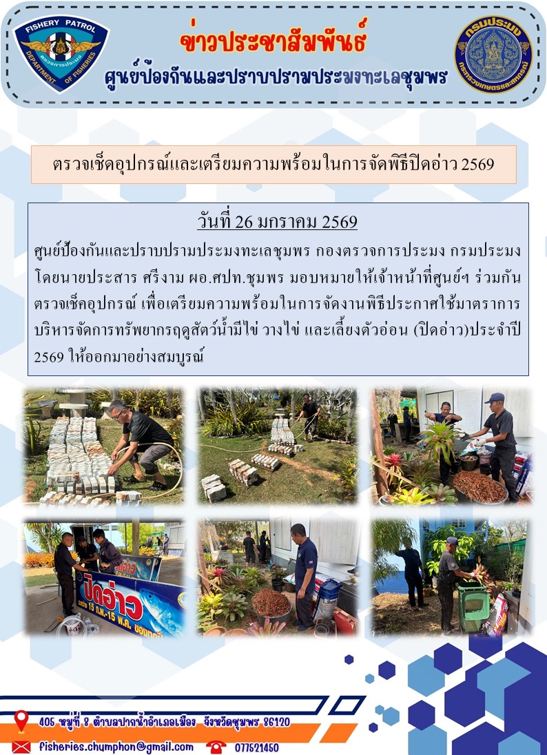วันที่ 26 มกราคม 2569 ศูนย์ป้องกันและปราบปรามประมงทะเลชุมพร กองตรวจการประมง กรมประมง โดยนายประสาร ศรีงาม ผอ.ศปท.ชุมพร มอบหมายให้เจ้าหน้าที่ศูนย์ฯ ร่วมกันตรวจเช็คอุปกรณ์ เพื่อเตรียมความพร้อมในการจัดงานพิธีประกาศใช้มาตราการบริหารจัดการทรัพยากรฤดูสัตว์น้ำมีไข่ วางไข่ และเลี้ยงตัวอ่อน (ปิดอ่าว)ประจำปี 2569 ให้ออกมาอย่างสมบูรณ์