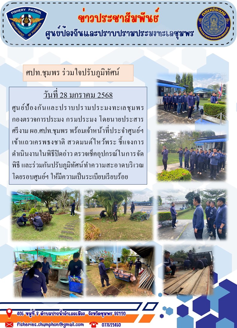 วันที่ 28 มกราคม 2568 ศูนย์ป้องกันและปราบปรามประมงทะเลชุมพร กองตรวจการประมง กรมประมง โดยนายประสาร ศรีงาม ผอ.ศปท.ชุมพร พร้อมเจ้าหน้าที่ประจำศูนย์ฯ เข้าแถวเครพธงชาติ สวดมนต์ไหว้พระ ชี้แจงการดำเนินงานในพิธีปิดอ่าว ตรวจเช็คอุปกรณ์ในการจัดพิธี และร่วมกันปรับภูมิทัศน์ทำความสะอาดบริเวณโดยรอบศูนย์ฯ ให้มีความเป็นระเบียบเรียบร้อย